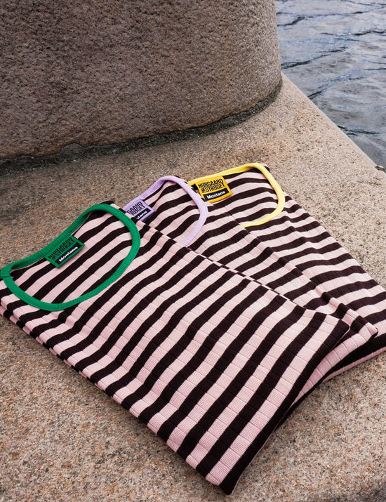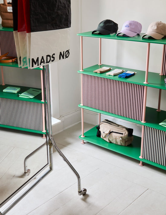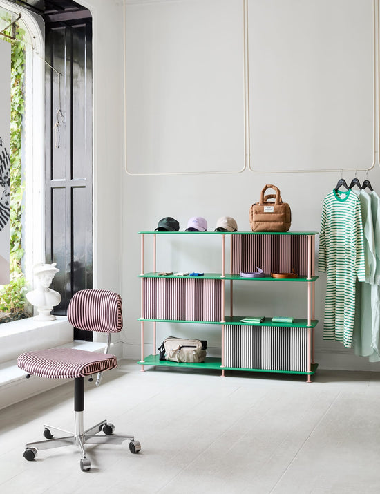 Die Mads Nørgaard – Copenhagen x Montana Furniture Zusammenarbeit repräsentiert eine frische Fusion von Mode und Möbeln, bei der kühne Streifen auf zeitloses Design treffen.