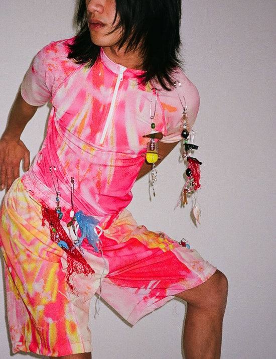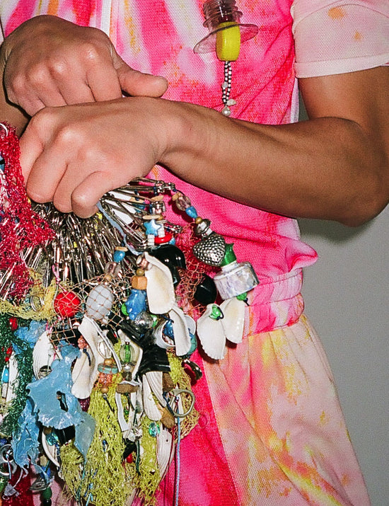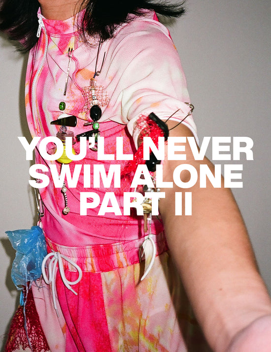 Jedes Set – T-Shirt und Shorts – ist ein Unikat und zeigt lebendige Prints aus Rists Werken. Als besonderes Detail enthält jedes Set handgefertigte Anhänger aus Perlen, Flaschendeckeln, Fischernetzen und anderen Strandfunden, damit du im Wasser nie allein bist. Daher der Titel You’ll Never Swim Alone.