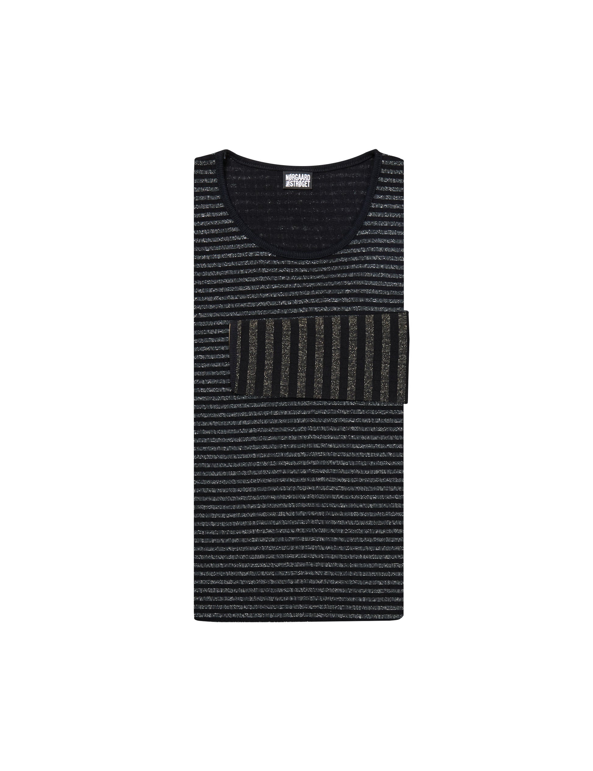 101 Glam Blok ist unser #101 T-Shirt in Glitzer. Die Ärmel sind Broadway in Schwarz und Gold und der Körper ist Fine Stripe in Schwarz und Silber. Das Nørgaard paa Strøgets #101 T-Shirt wurde 1967 von Jørgen Nørgaard entworfen. Das T-Shirt wird in Dänemark gestrickt, gefärbt und genäht und besteht aus 92% Baumwolle 8% Lurex. Das T-Shirt #101 hat eine Einheitsgröße, ist aber in zwei verschiedenen Längen erhältlich. Das Langarm-T-Shirt wird in drei verschiedenen Varianten und zwei verschiedenen Längen hergestellt.