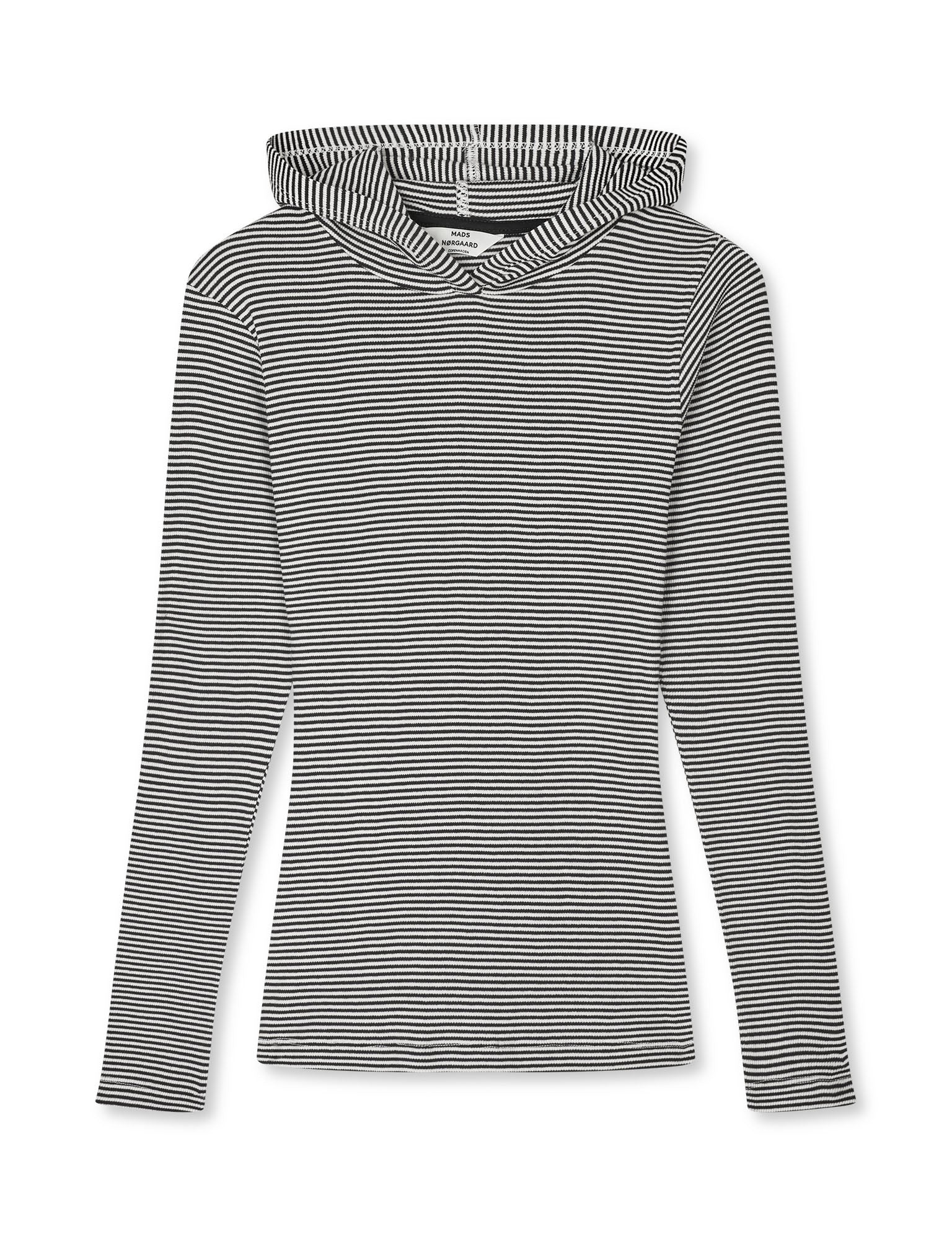 Eng anliegendes und dehnbares Langarmshirt mit einer Kapuze und mit Streifen.