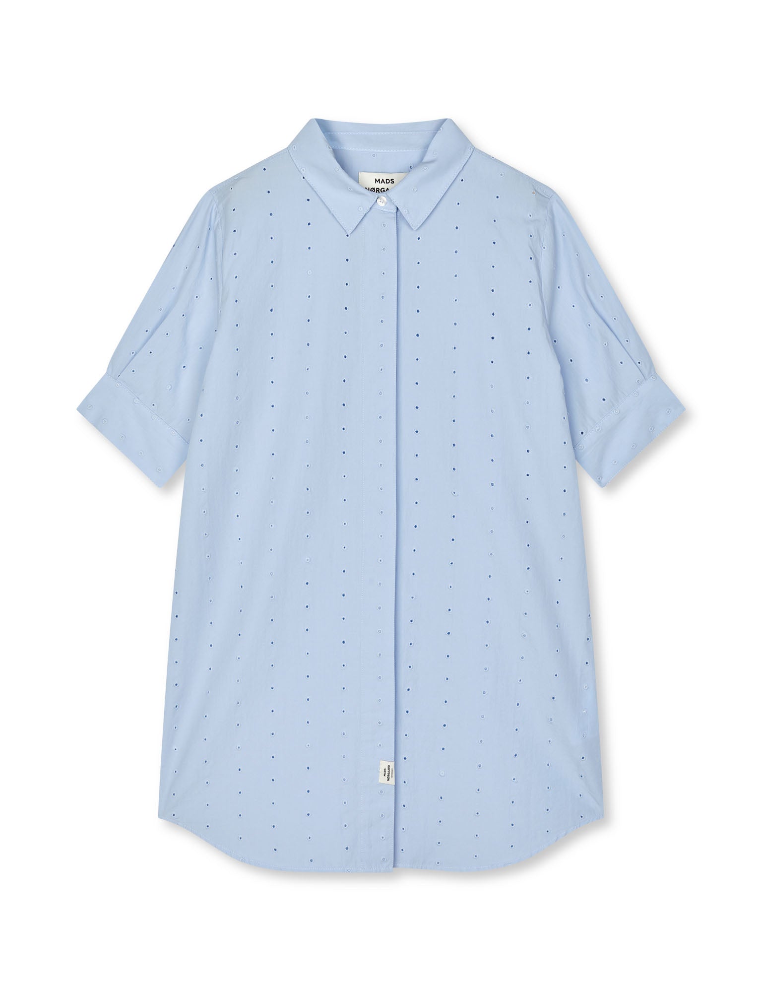 Lockere Midikleid mit kurzen Ärmeln aus knackigem Baumwollpopeline, mit klassischem Hemdkragen, Knopfleiste vorne und feinen Stickdetails.