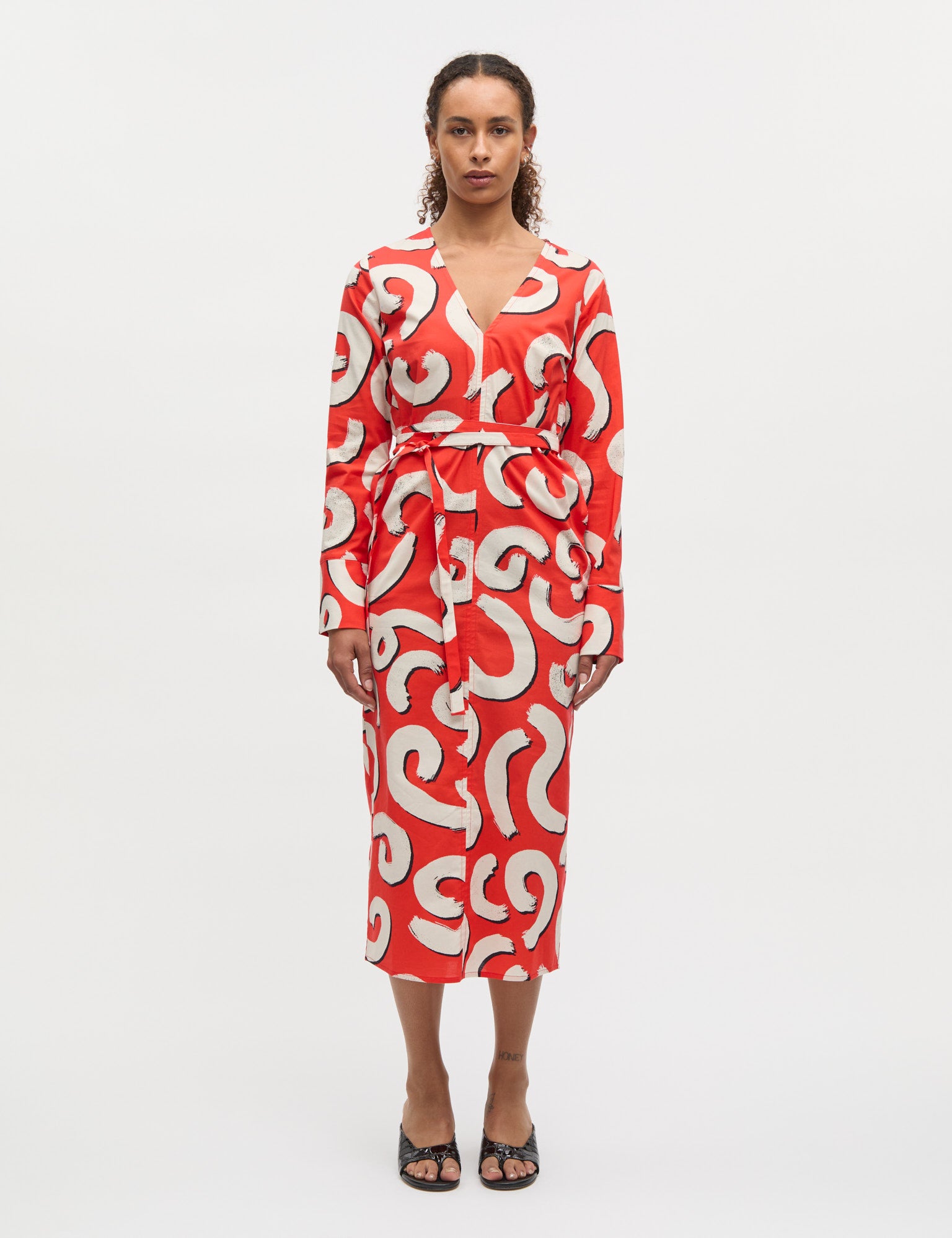 Midi-Kleid mit V-Ausschnitt, langen Ärmeln, Bindegürtel in der Taille und auffälligem grafischem Muster.