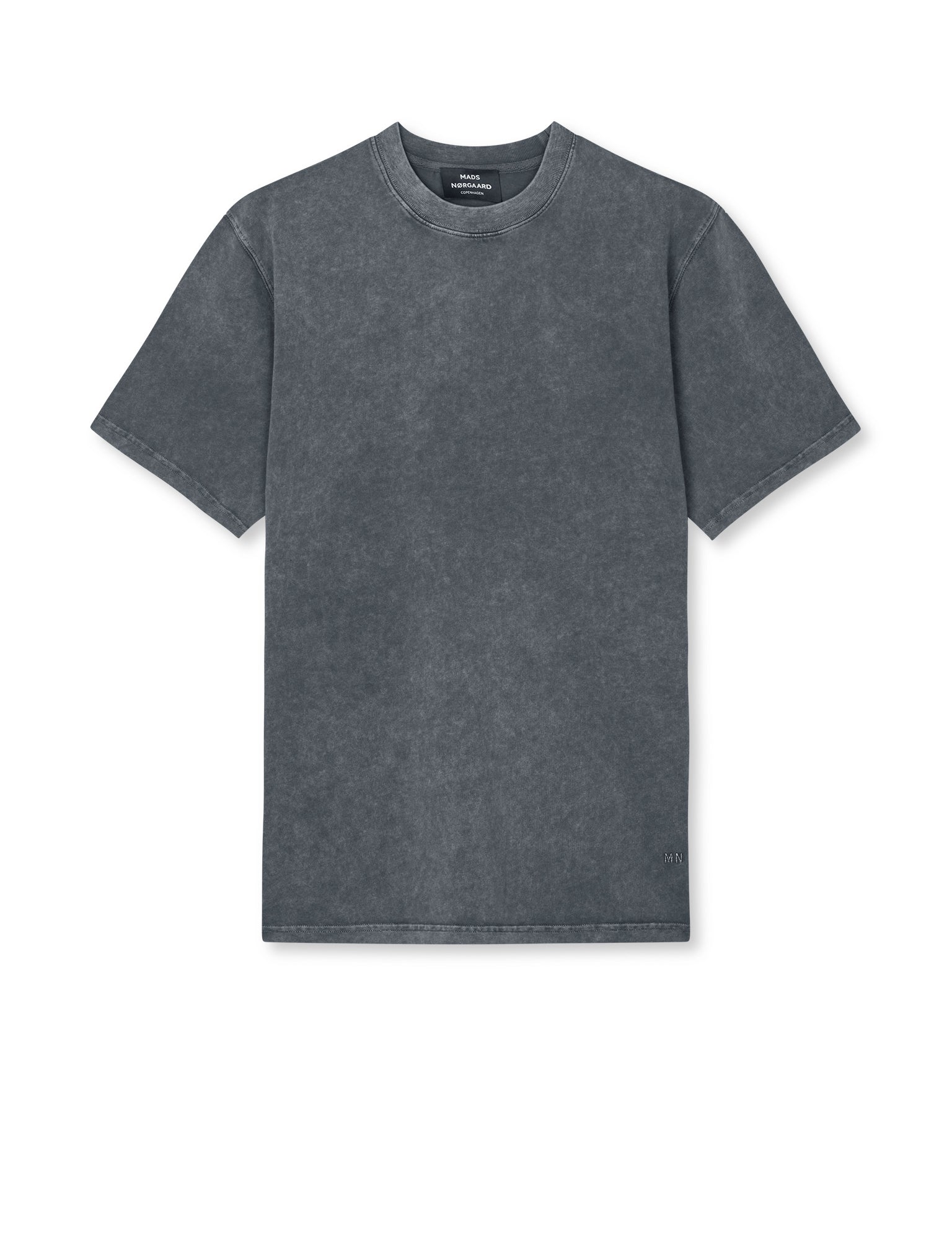 Kräftiges, boxy T-Shirt mit kurzen Ärmeln, einem Rundhalsausschnitt und einem kleinen aufgestickten Initialen-Logo auf Hüfthöhe.