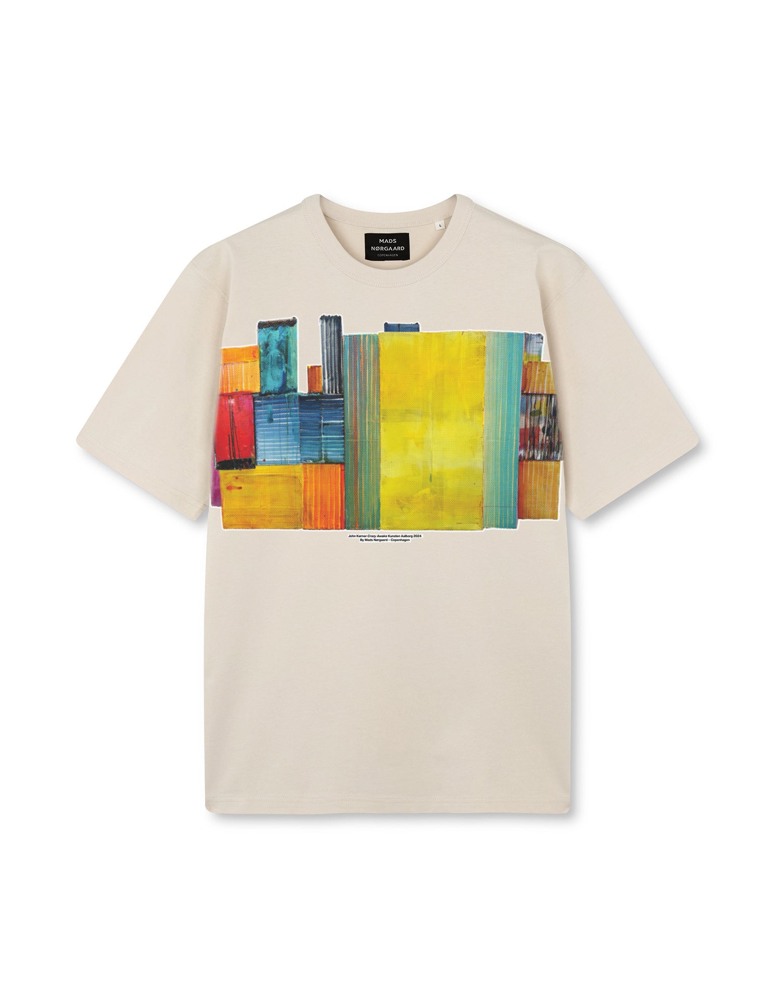 In Verbindung mit John Kørners neuer Ausstellung "Crazy Awake" im Kunsten Museum of Modern Art hat Mads Nørgaard - Copenhagen eine Minikollektion mit einem Rephotographiedruck eines von Johns Kunstwerken erstellt. Dieses Modell ist aus weicher und schwerer Baumwolle gefertigt. Die Passform ist oversized mit überschnittenen Schultern und einem Druck auf der Brust.