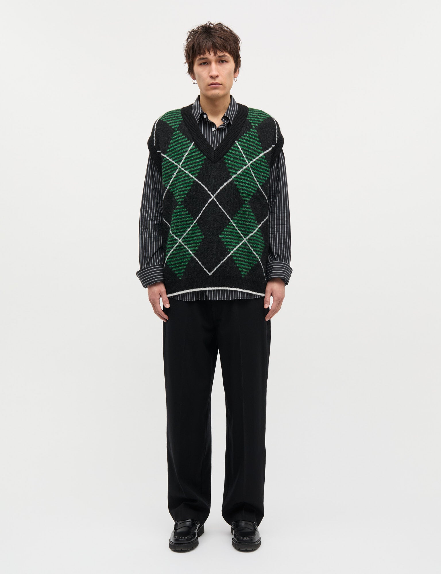 Weiche und boxy geschnittene Strickweste mit Harlekin-Karomuster, Streifen, V-Ausschnitt und Rippbündchen.
