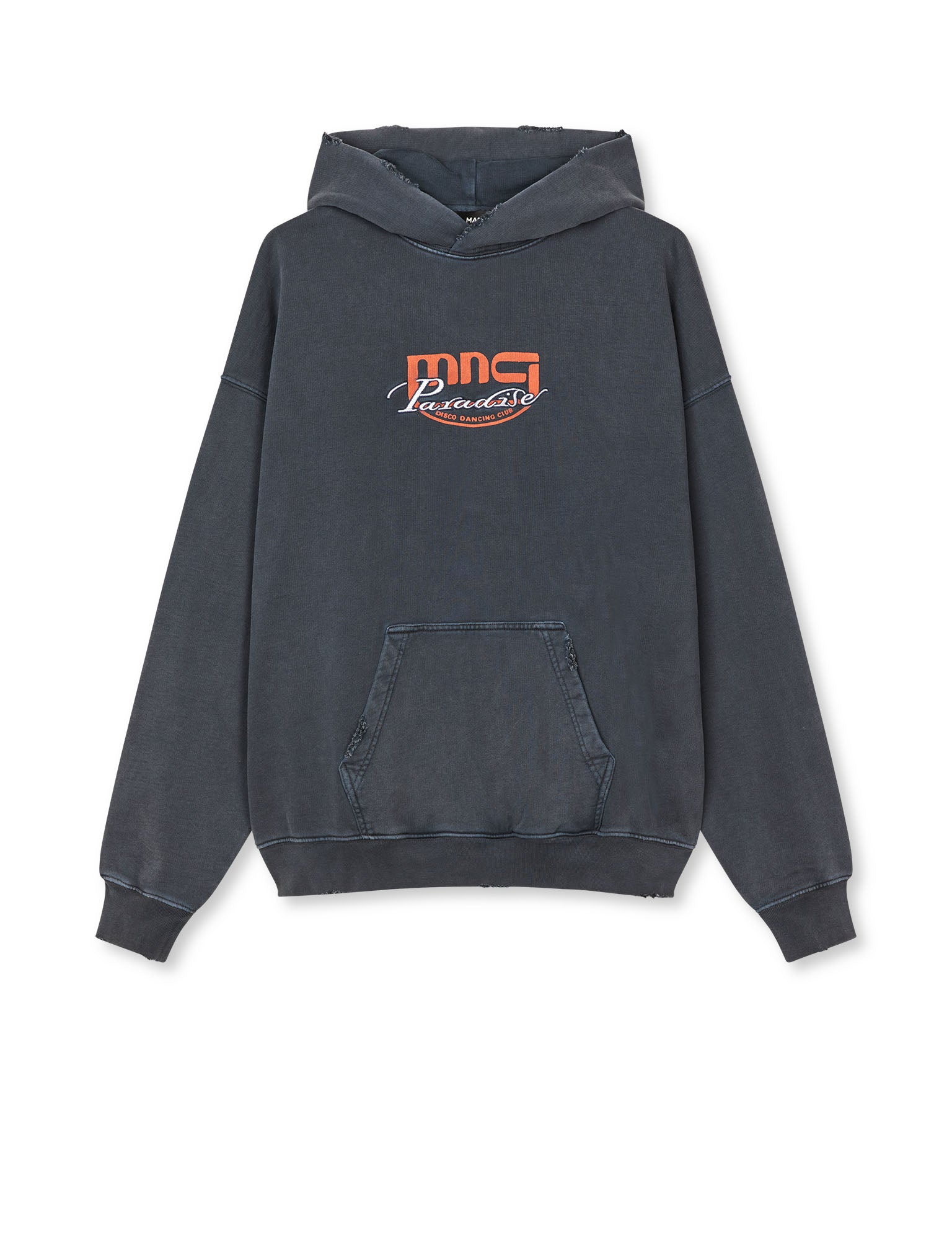 Boxy Kapuzenpullover aus weicher Bio-Baumwolle mit Dropped-Shoulders, Rippbündchen, einer Kängurutasche und einem Print auf Brust und Rücken.