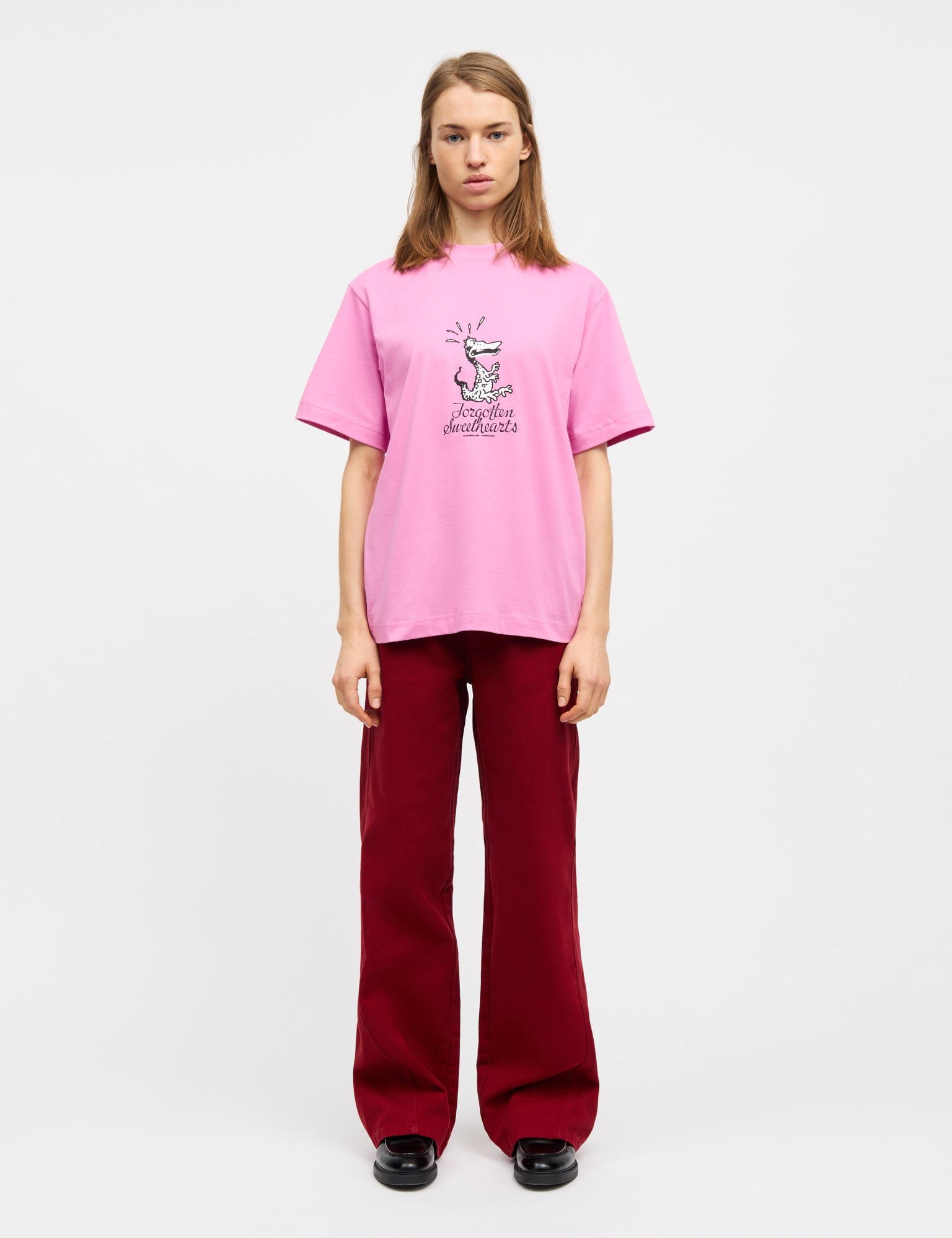 Weiches und leicht oversized geschnittenes T-Shirt mit etwas längeren kurzen Ärmeln und einem Print auf der Brust.