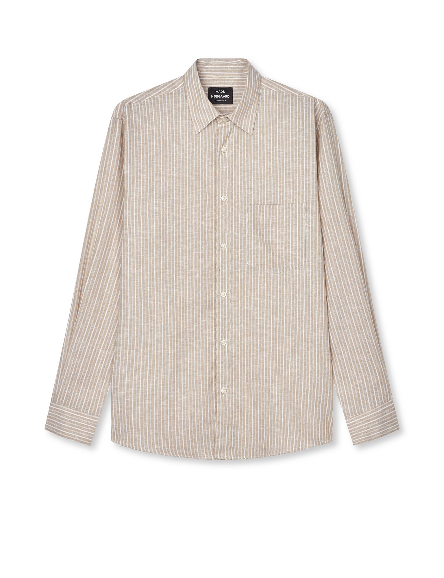 Cotton Linen Sune Stripe ist ein glattes und geschmeidiges Hemd aus Leinen und Baumwolle. Die Passform ist normal und durchgehend relativ gerade geschnitten, mit kleinen Knöpfen, dünnen Streifen und einem Kragen im Button-down-Stil.