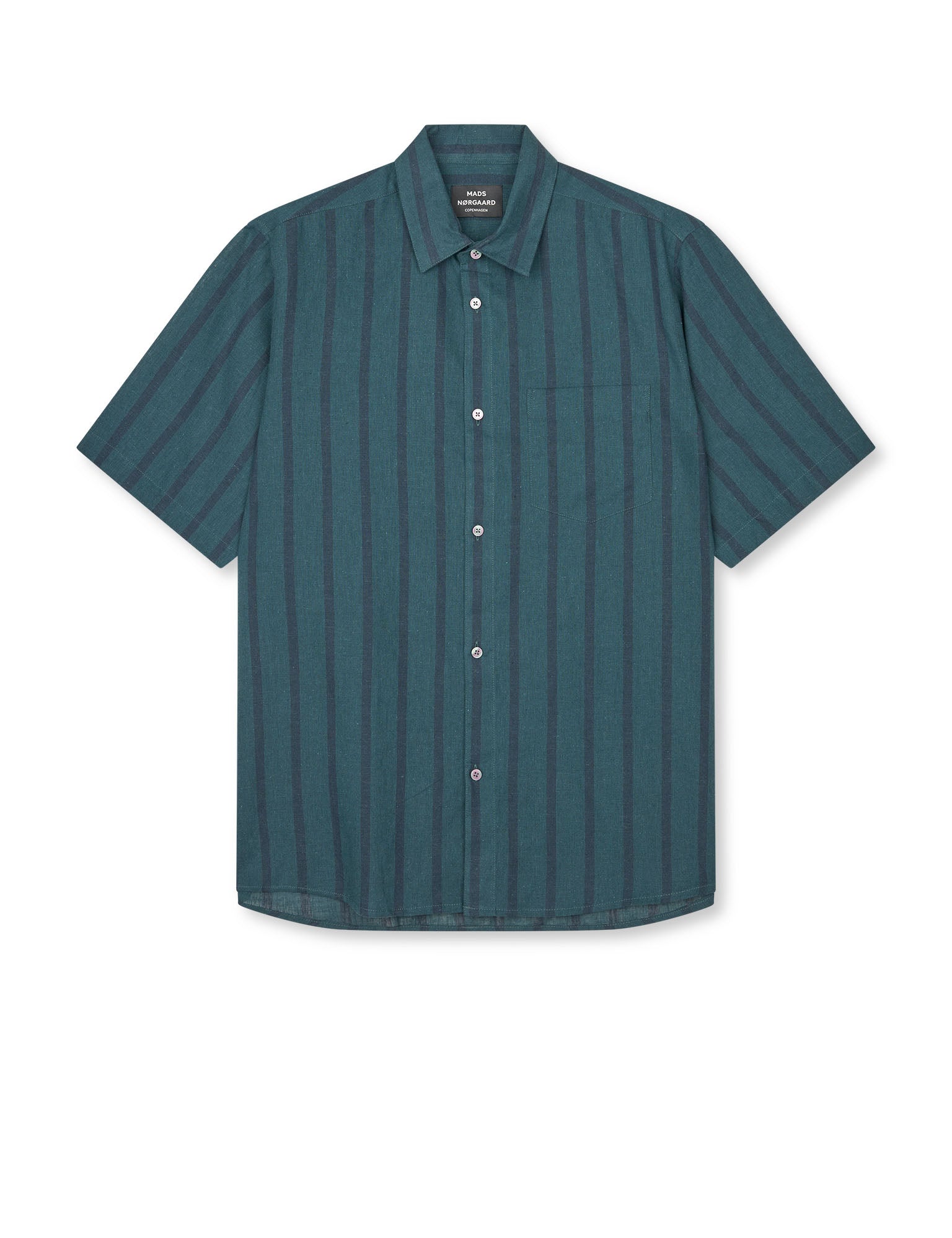 Das Cotton Linen Victor Stripe ist ein glattes und geschmeidiges Kurzarmhemd aus Leinen und Baumwolle. Die Passform ist normal und durchgehend relativ gerade geschnitten, mit kleinen Knöpfen und einem Kragen im Cut-away-Stil.