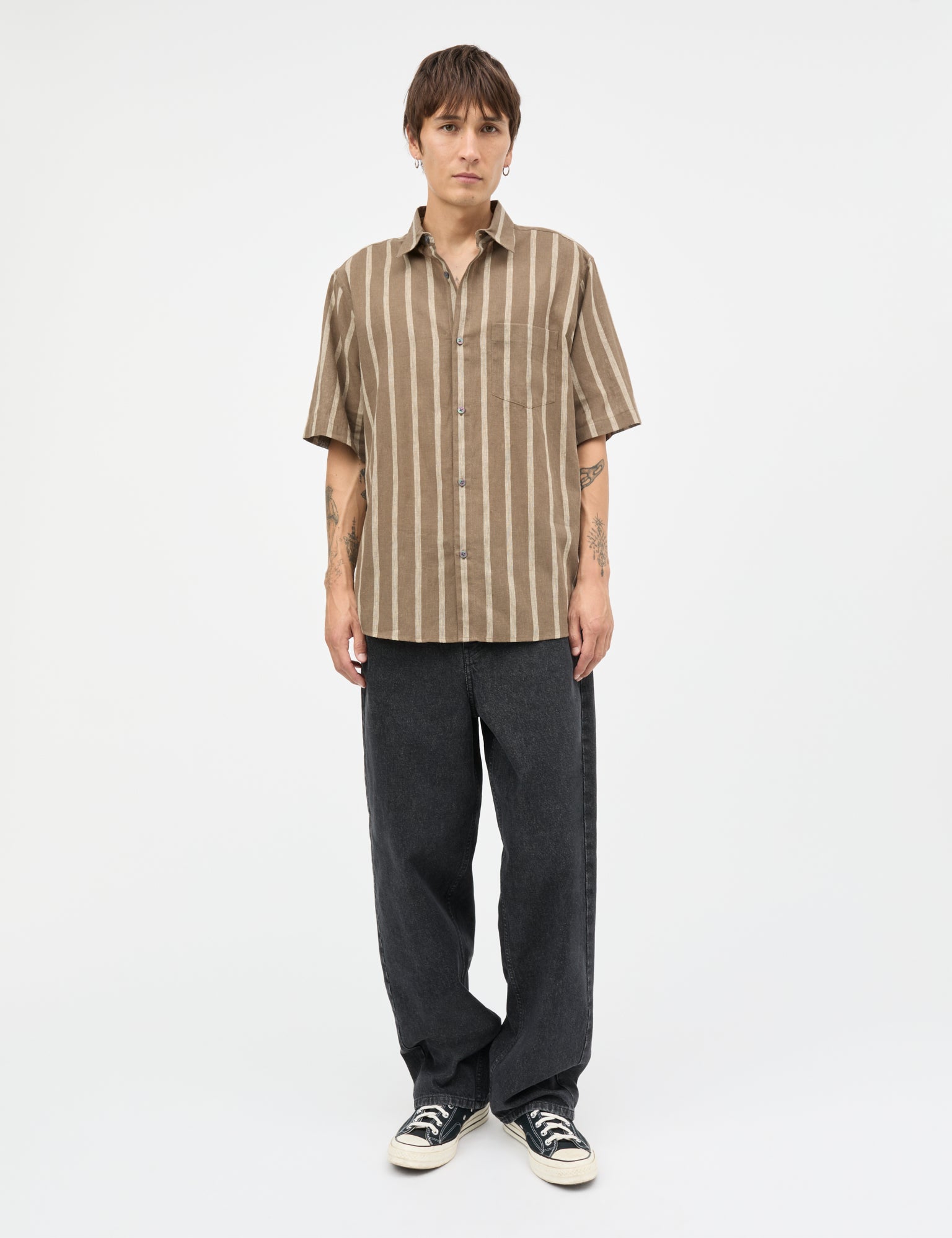 Das Cotton Linen Victor Stripe ist ein glattes und geschmeidiges Kurzarmhemd aus Leinen und Baumwolle. Die Passform ist normal und durchgehend relativ gerade geschnitten, mit kleinen Knöpfen und einem Kragen im Cut-away-Stil.
