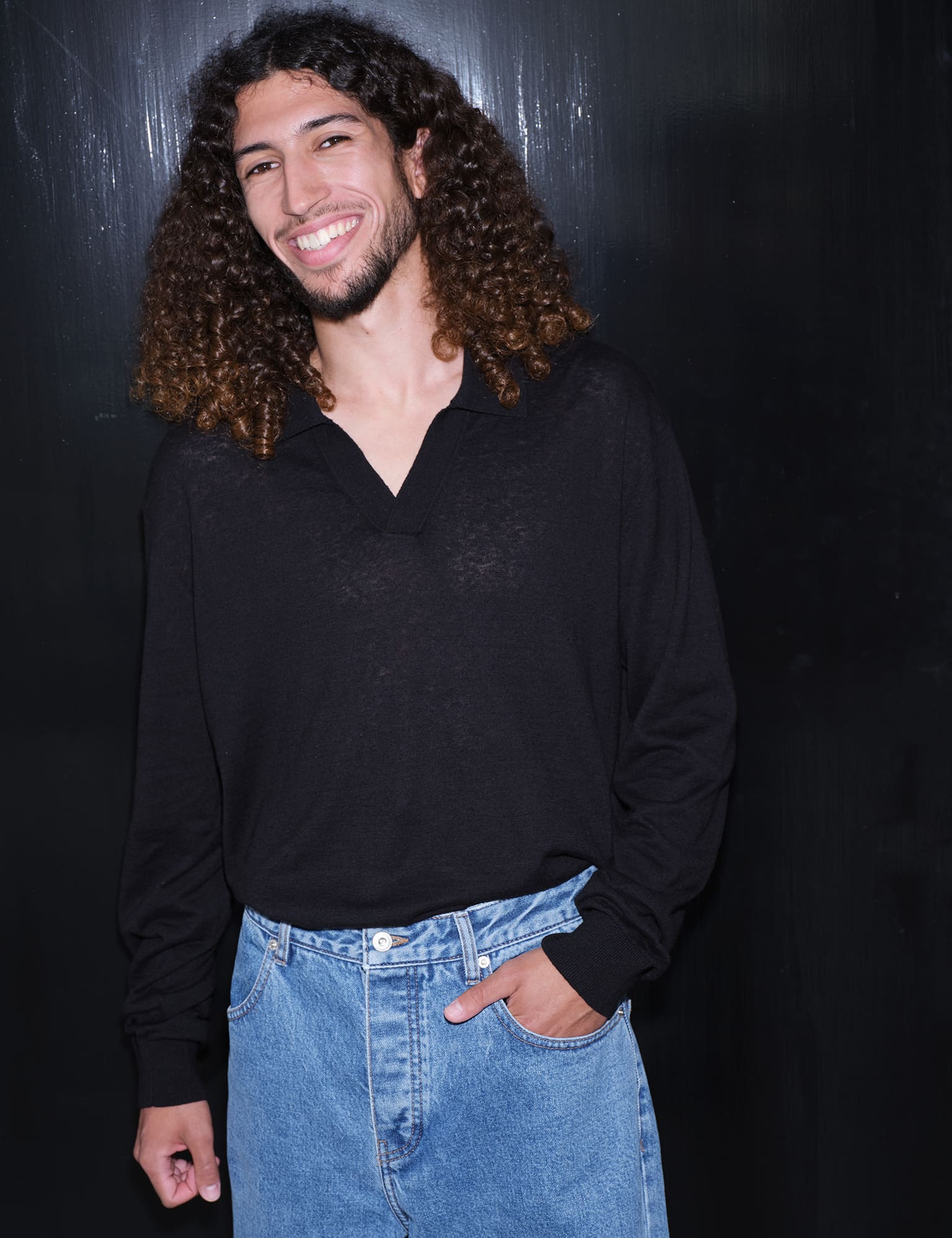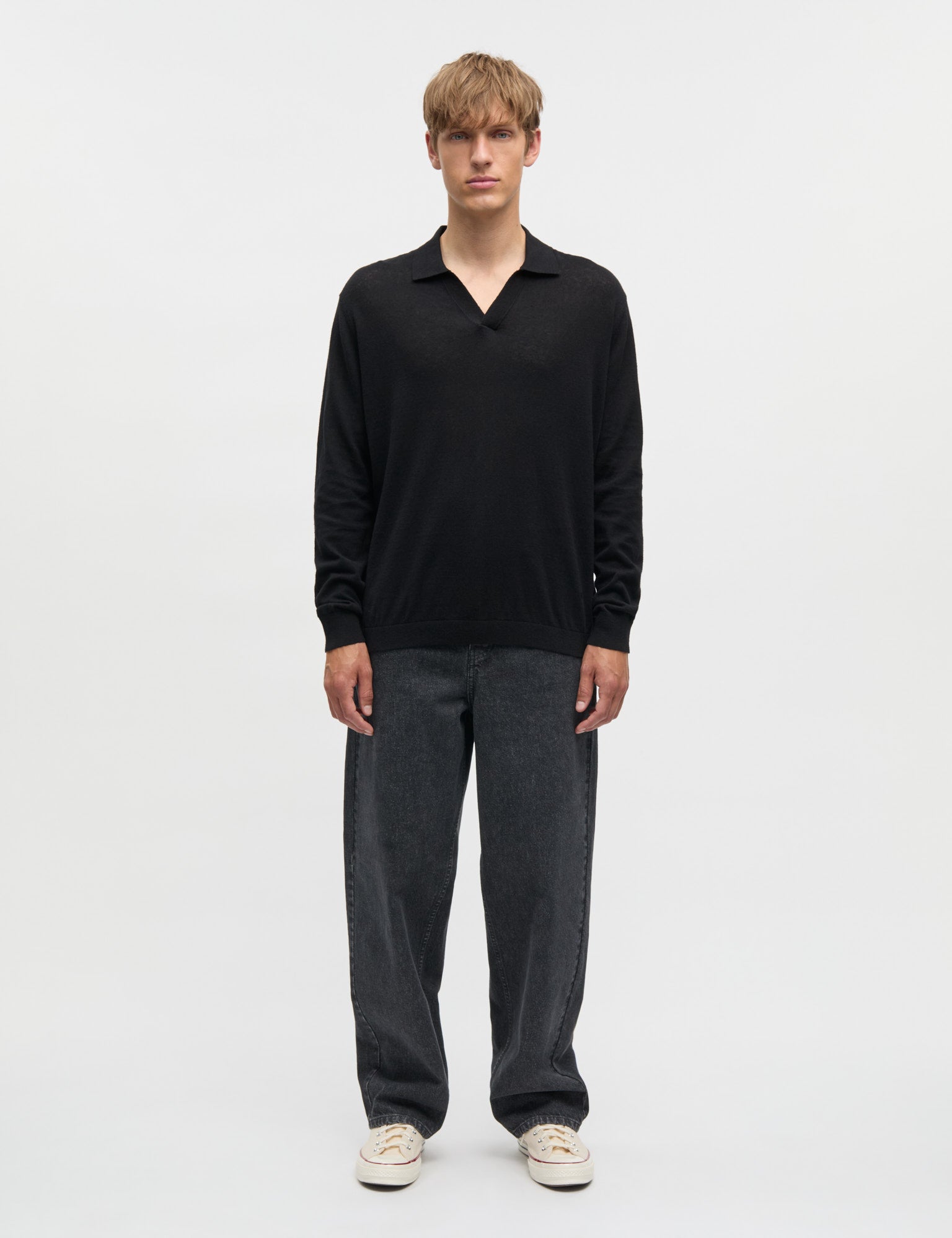 Fein gestrickter Pullover mit offenem Polokragen. Gerade Passform und Rippbündchen an den Ärmeln und am Saum.