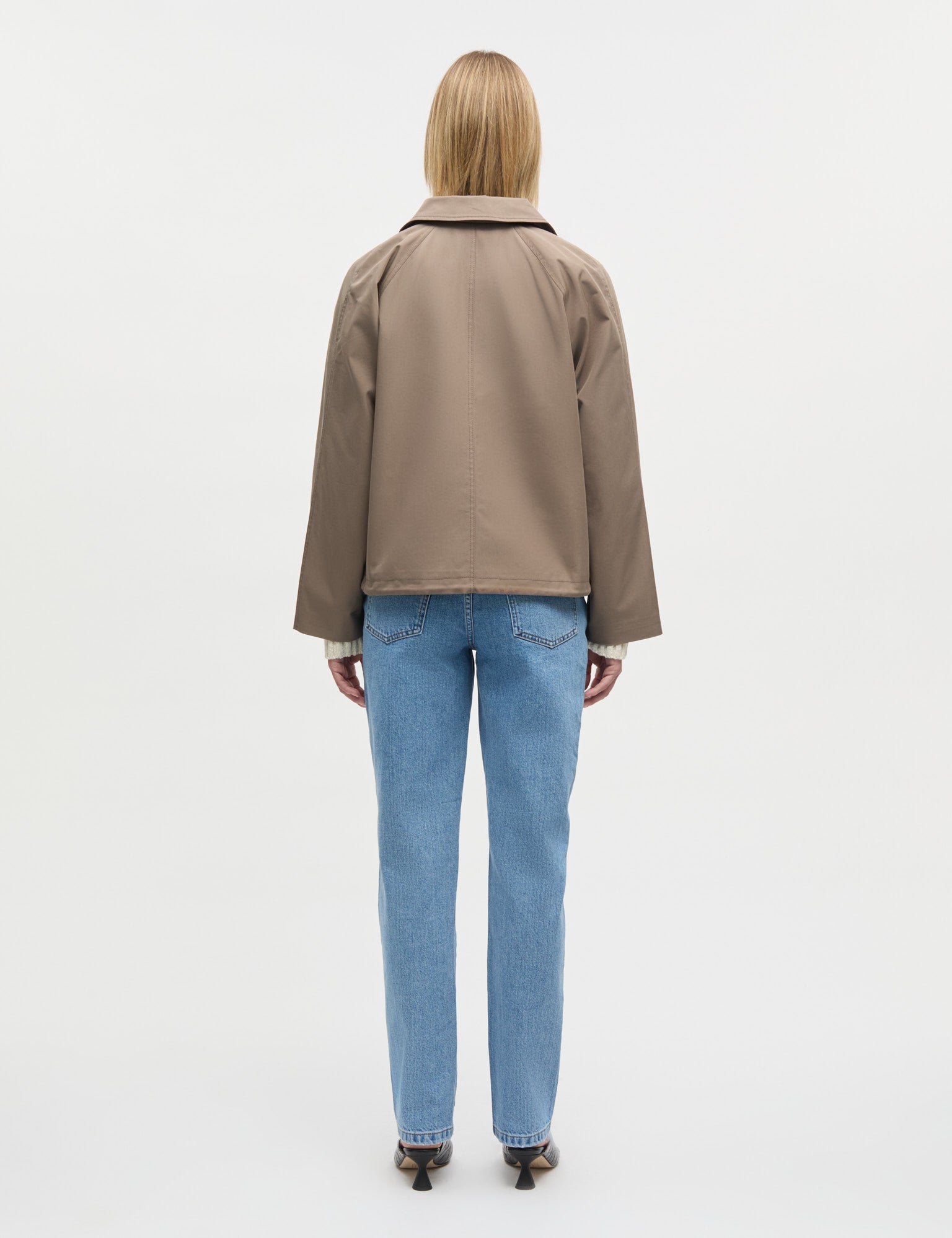 Kurze Jacke mit klassischem Kragen und Reißverschluss vorne. Mit großen aufgesetzten Taschen, verstellbarem Kordelzug am Saum und langen Ärmeln. Gerade, praktische Passform.