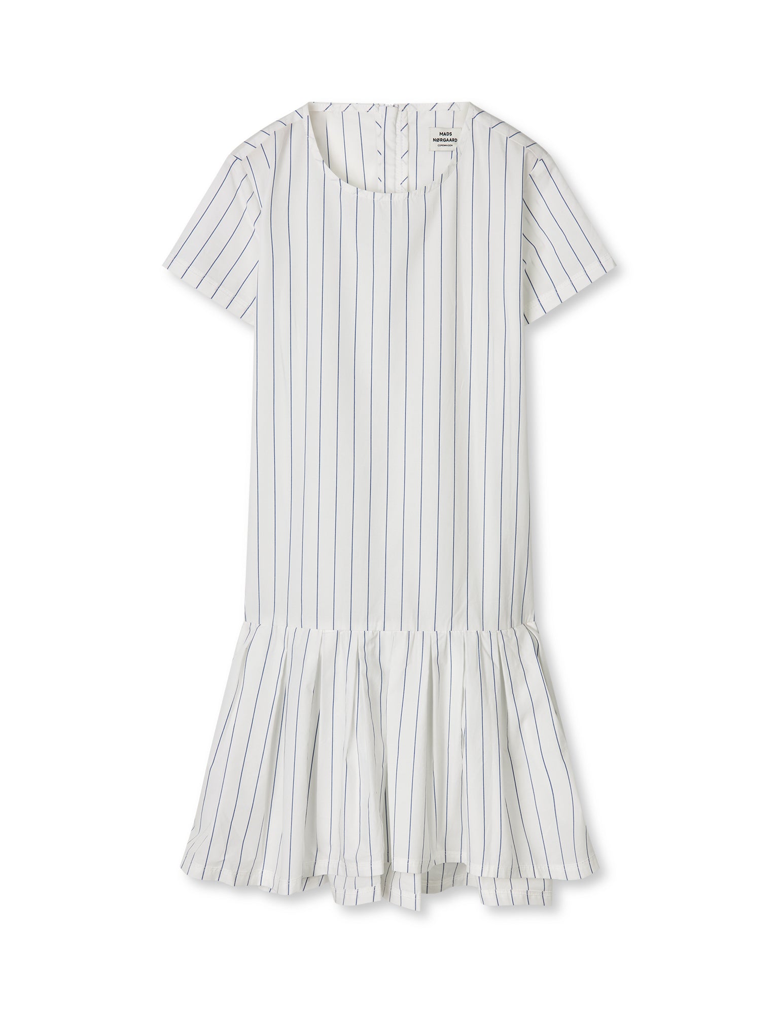 Crisp Popeline Drastina ist ein knielanges Kleid aus fester, glatter Baumwolle mit kurzen Ärmeln, schmalen Streifen und einem Rock mit Kellerfalten.
