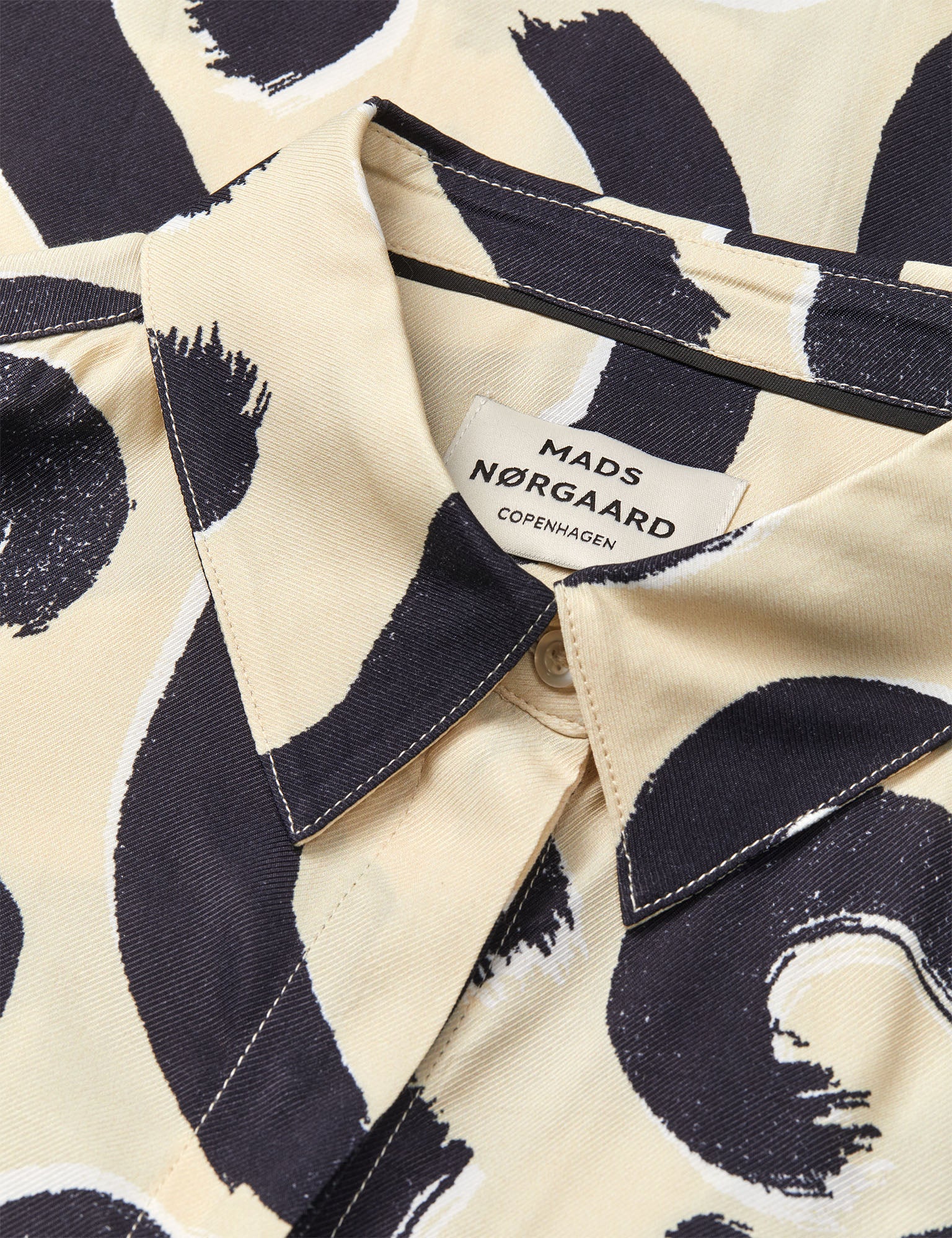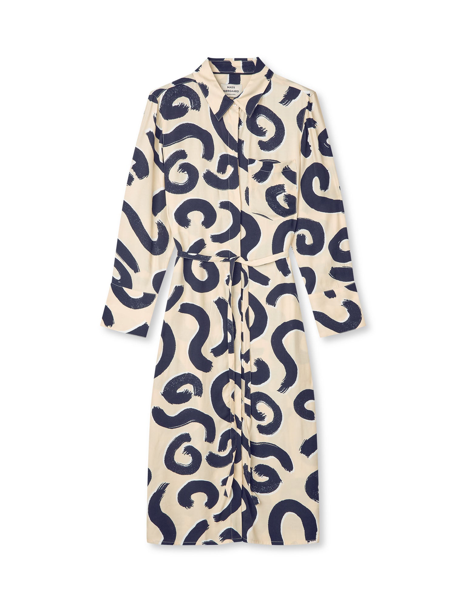 Knie-langes Midikleid mit klassischem Kragen, Knopfleiste vorne, langen Ärmeln und Bindegürtel in der Taille. Leichte A-förmige Silhouette.
