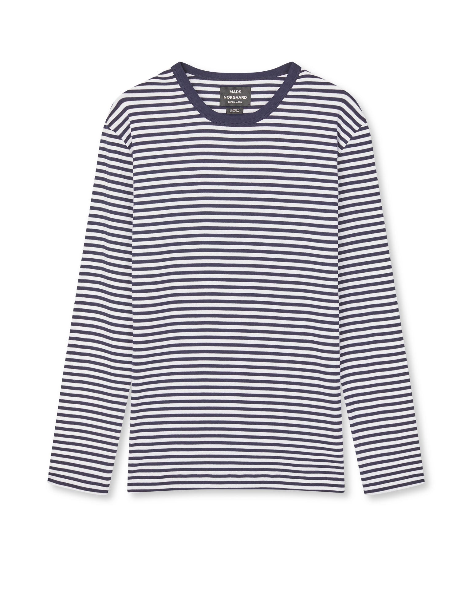 Langärmeliges T-Shirt mit schmalen Querstreifen. Normale Passform und Rundhalsausschnitt mit einfarbigem Kragen. Dieses T-Shirt ist so entworfen, dass es perfekt sitzt und sich genau richtig anfühlt. Es wird aus langfaseriger Baumwolle gefertigt und bietet dadurch ein weiches, angenehmes Tragegefühl sowie eine Passform, die auch nach vielen Wäschen erhalten bleibt. Der Stoff wird bei einem familiengeführten Strickbetrieb in Dänemark, gestrickt, der seit Jahrzehnten ein fester Partner von Mads Nørgaard ist. Hier wird die lokale Stricktradition mit Stolz gepflegt, und jeder einzelne Schritt der Produktion wird sorgfältig begleitet. Das T-Shirt hat einen klassischen Schnitt mit einem modernen Twist – sei es im Detail, in der Farbe oder im Streifenmuster.