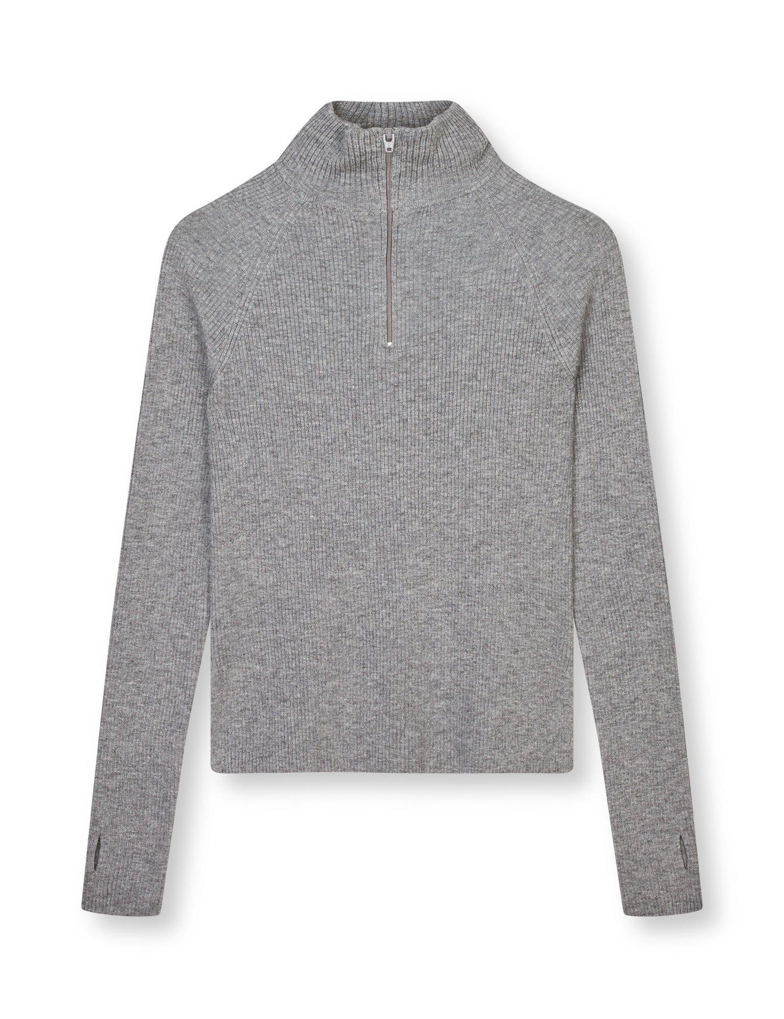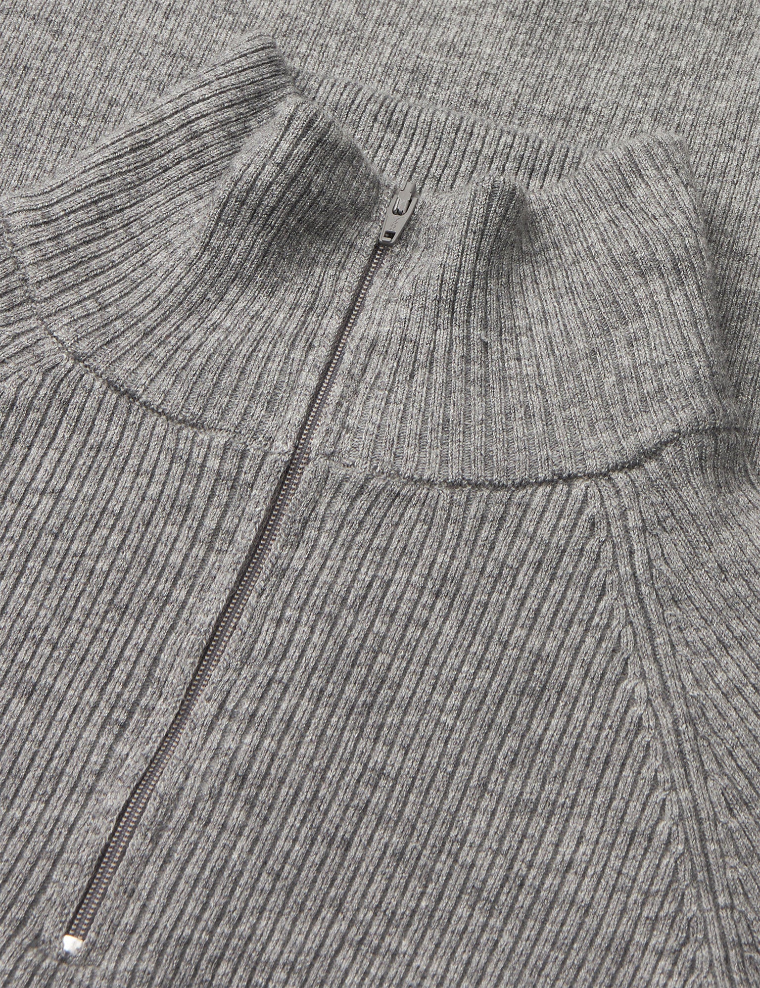 Eng anliegender, gerippter Strickpullover mit hohem Kragen und mit einem Reißverschluss.