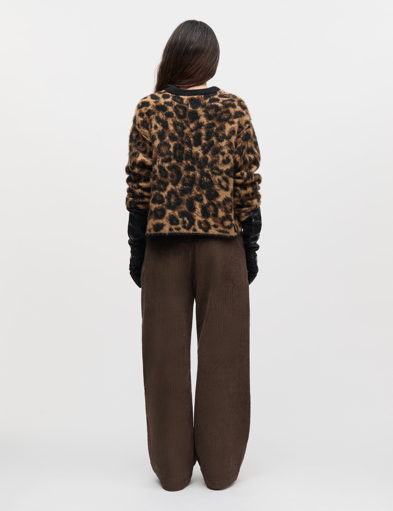 Locker und boxy geschnittener, weicher Strickpullover mit Dropped-Shoulders und einem eingestrickten Leopardenmuster.