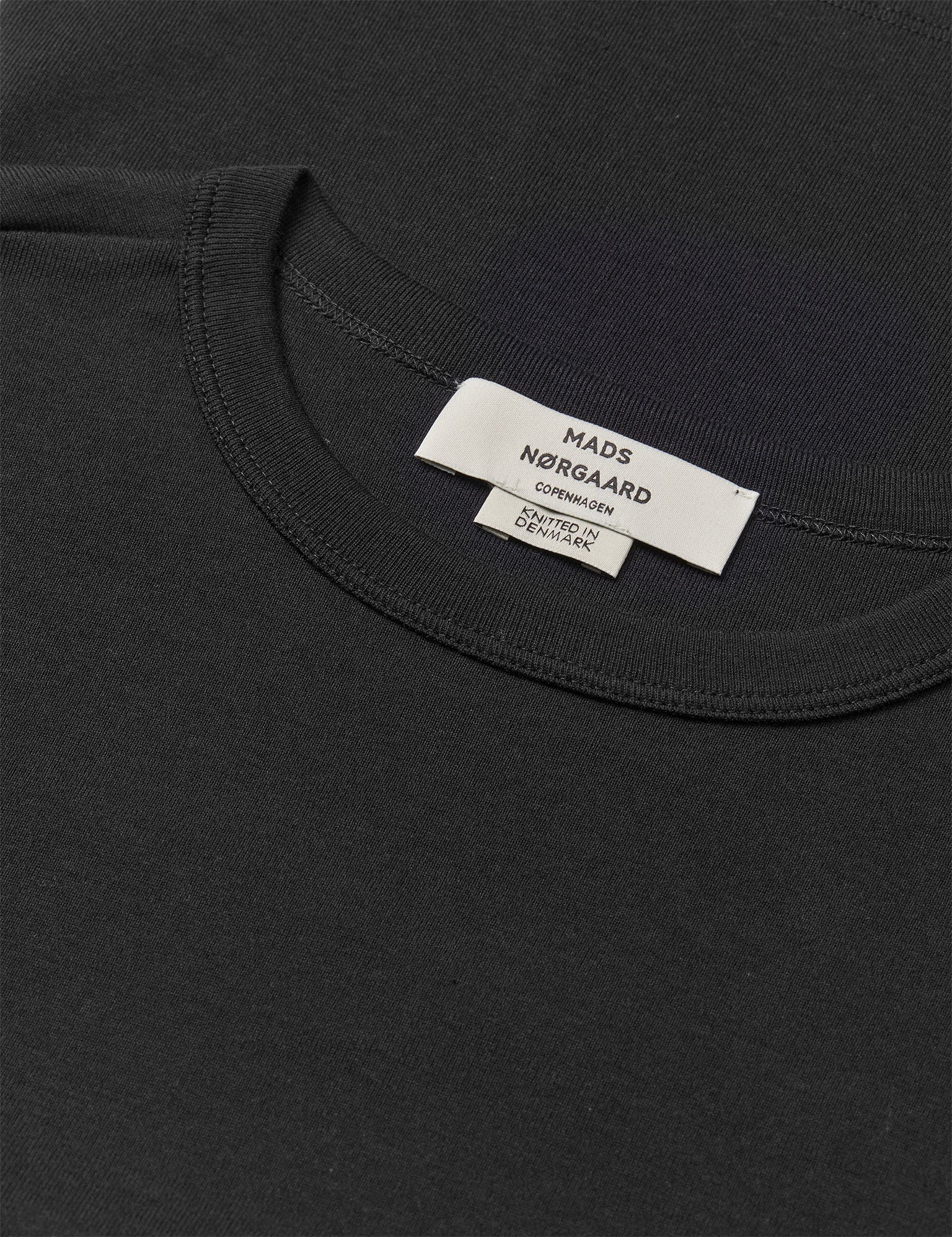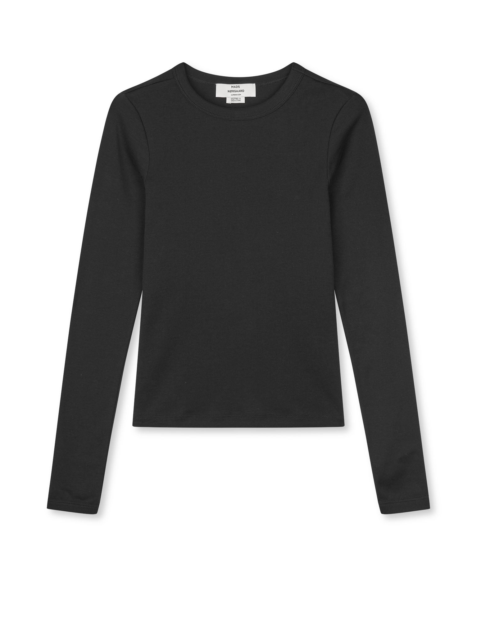 Eng anliegende Bluse mit Rundhalsausschnitt, langen Ärmeln und gleichmäßiger, elastischer Passform. Dieses T-Shirt ist so entworfen, dass es perfekt sitzt und sich genau richtig anfühlt. Es wird aus langfaseriger Baumwolle gefertigt und bietet dadurch ein weiches, angenehmes Tragegefühl sowie eine Passform, die auch nach vielen Wäschen erhalten bleibt. Der Stoff wird bei einem familiengeführten Strickbetrieb in Dänemark, gestrickt, der seit Jahrzehnten ein fester Partner von Mads Nørgaard ist. Hier wird die lokale Stricktradition mit Stolz gepflegt, und jeder einzelne Schritt der Produktion wird sorgfältig begleitet Das T-Shirt hat einen klassischen Schnitt mit einem modernen Twist – sei es im Detail, in der Farbe oder im Streifenmuster.