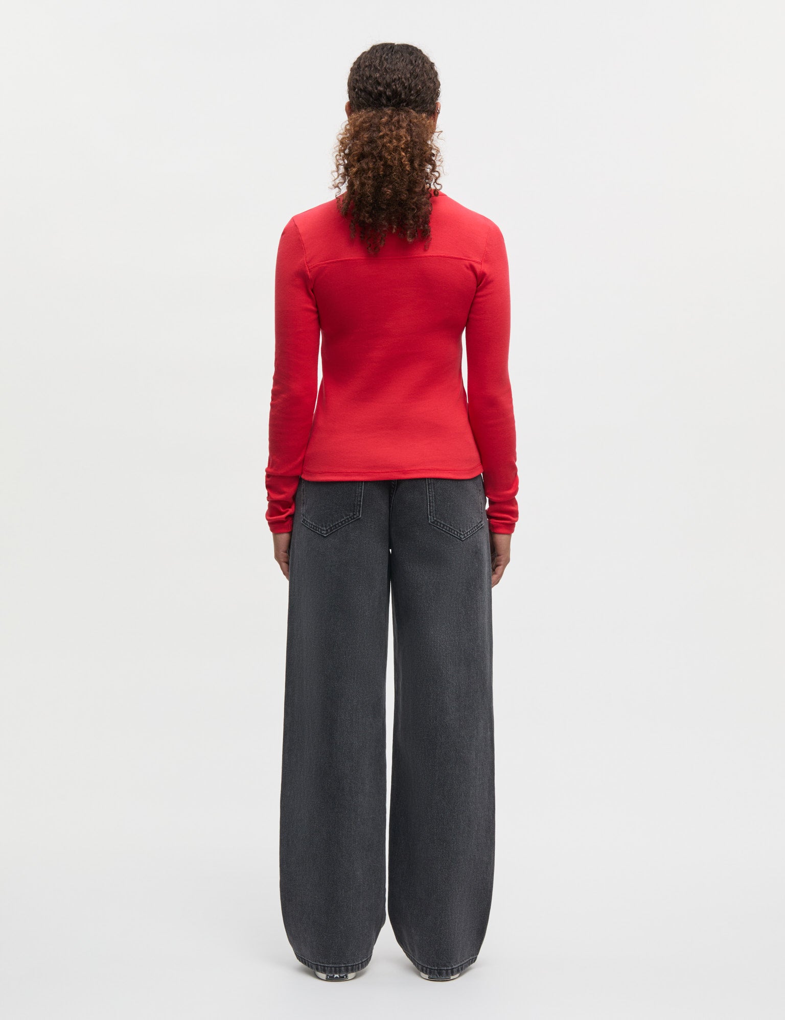 Eng anliegende Bluse mit Rundhalsausschnitt, langen Ärmeln und gleichmäßiger, elastischer Passform. Dieses T-Shirt ist so entworfen, dass es perfekt sitzt und sich genau richtig anfühlt. Es wird aus langfaseriger Baumwolle gefertigt und bietet dadurch ein weiches, angenehmes Tragegefühl sowie eine Passform, die auch nach vielen Wäschen erhalten bleibt. Der Stoff wird bei einem familiengeführten Strickbetrieb in Dänemark, gestrickt, der seit Jahrzehnten ein fester Partner von Mads Nørgaard ist. Hier wird die lokale Stricktradition mit Stolz gepflegt, und jeder einzelne Schritt der Produktion wird sorgfältig begleitet Das T-Shirt hat einen klassischen Schnitt mit einem modernen Twist – sei es im Detail, in der Farbe oder im Streifenmuster.
