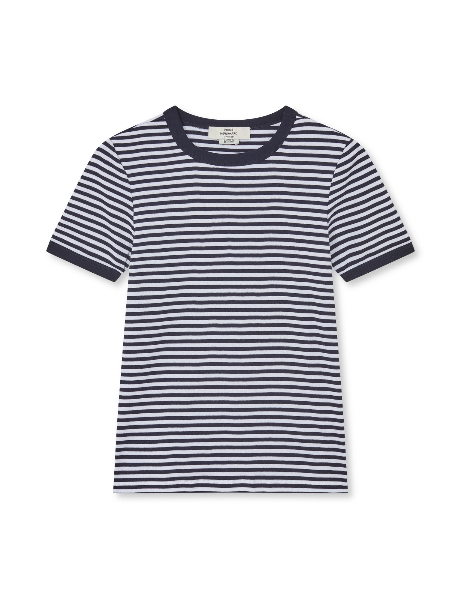 Einfaches, eng anliegendes T-Shirt mit Rundhalsausschnitt, kurzen Ärmeln und glatter Oberfläche. Dieses T-Shirt ist so entworfen, dass es perfekt sitzt und sich genau richtig anfühlt. Es wird aus langfaseriger Baumwolle gefertigt und bietet dadurch ein weiches, angenehmes Tragegefühl sowie eine Passform, die auch nach vielen Wäschen erhalten bleibt. Der Stoff wird bei einem familiengeführten Strickbetrieb in Dänemark, gestrickt, der seit Jahrzehnten ein fester Partner von Mads Nørgaard ist. Hier wird die lokale Stricktradition mit Stolz gepflegt, und jeder einzelne Schritt der Produktion wird sorgfältig begleitet. Das T-Shirt hat einen klassischen Schnitt mit einem modernen Twist – sei es im Detail, in der Farbe oder im Streifenmuster.
