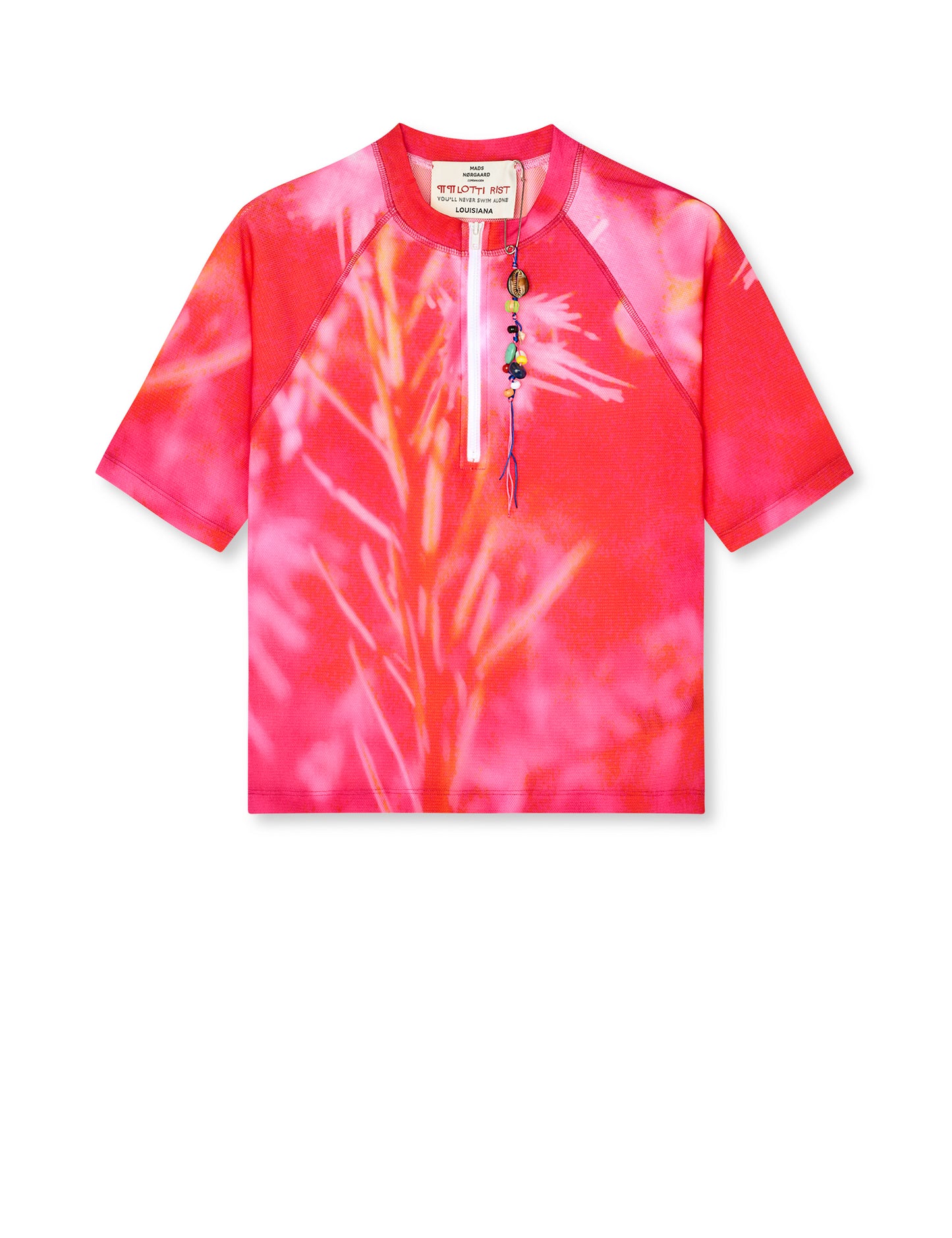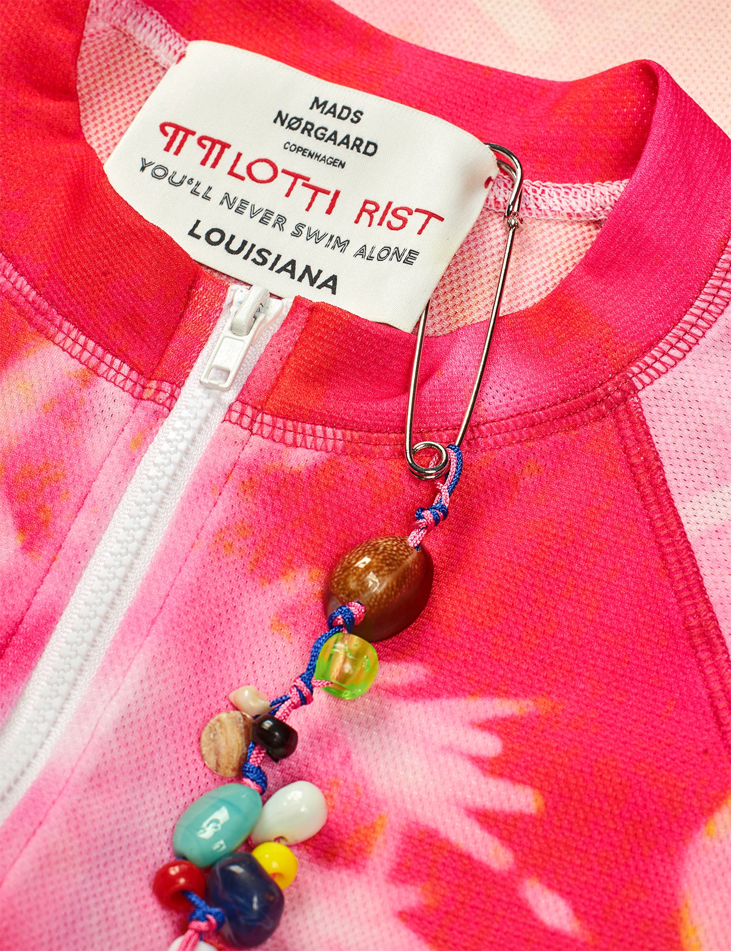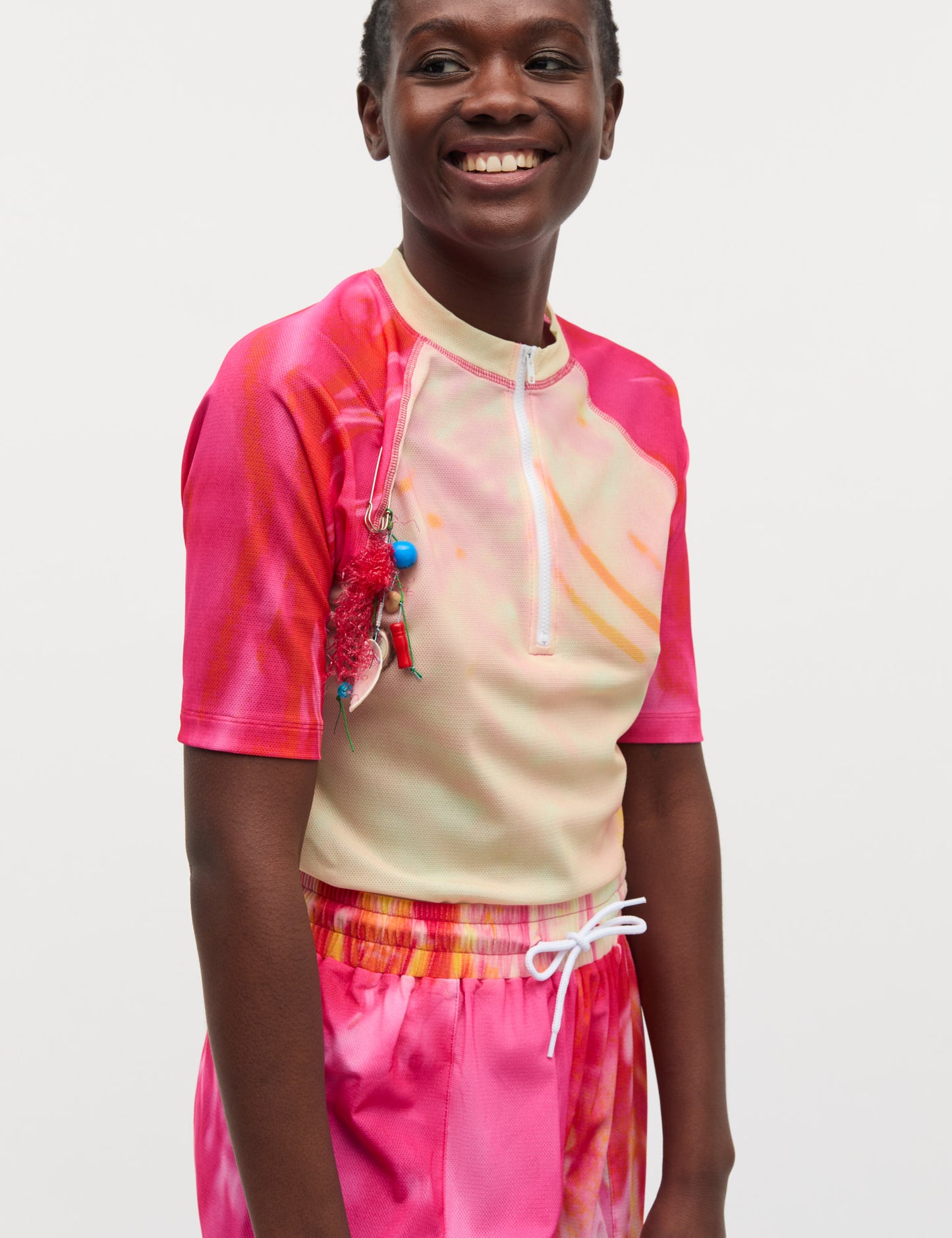 T-shirt with a round neckline and zipper from the swimwear collaboration with Pipilotti Rist x Louisiana x Mads Nørgaard – Copenhagen. The t-shirt is unique with vibrant prints from Rist's works and decorated with handmade pendants made of beads, capsules, fishing nets, and other beach finds. The t-shirt is unisex and has a straight up and down fit.