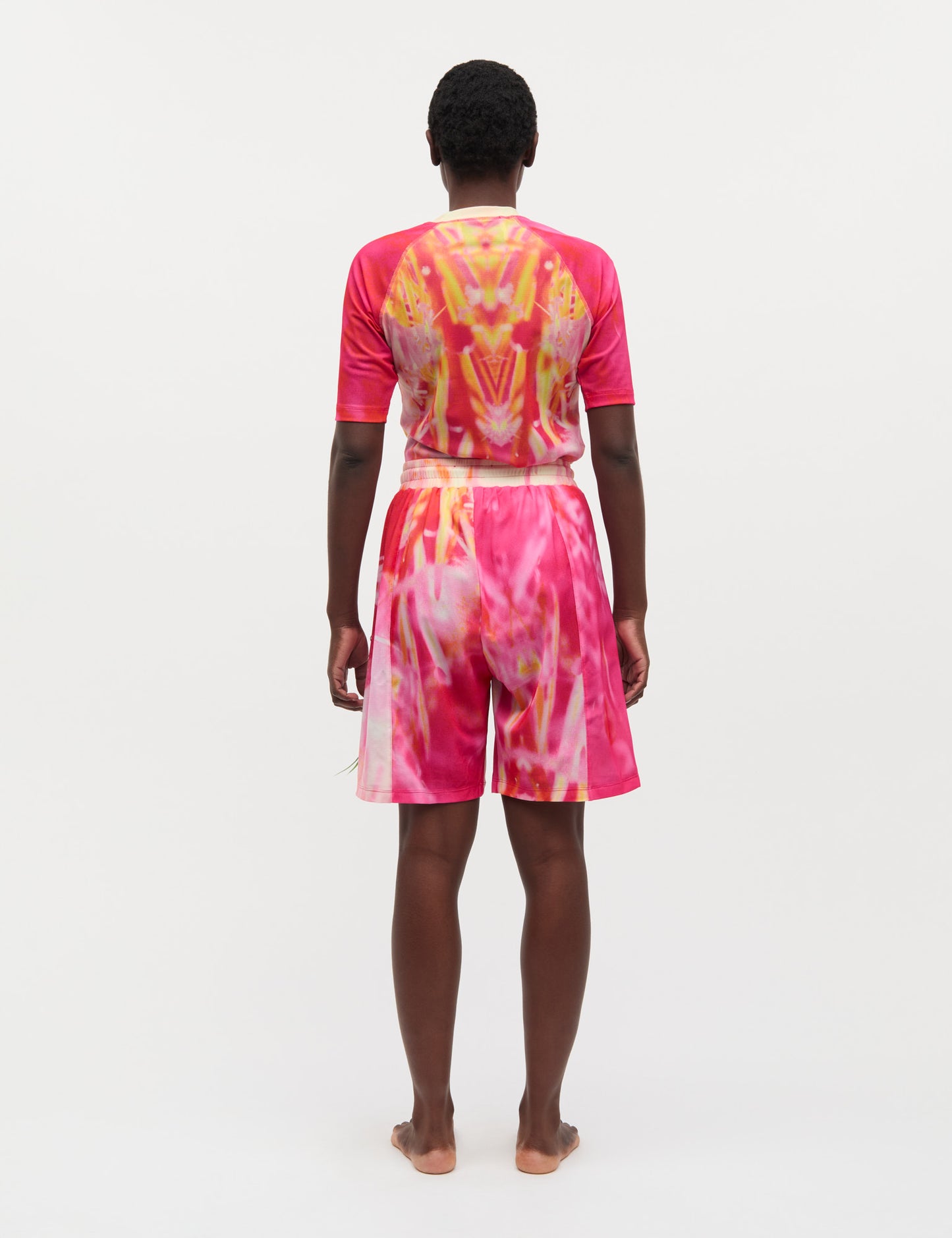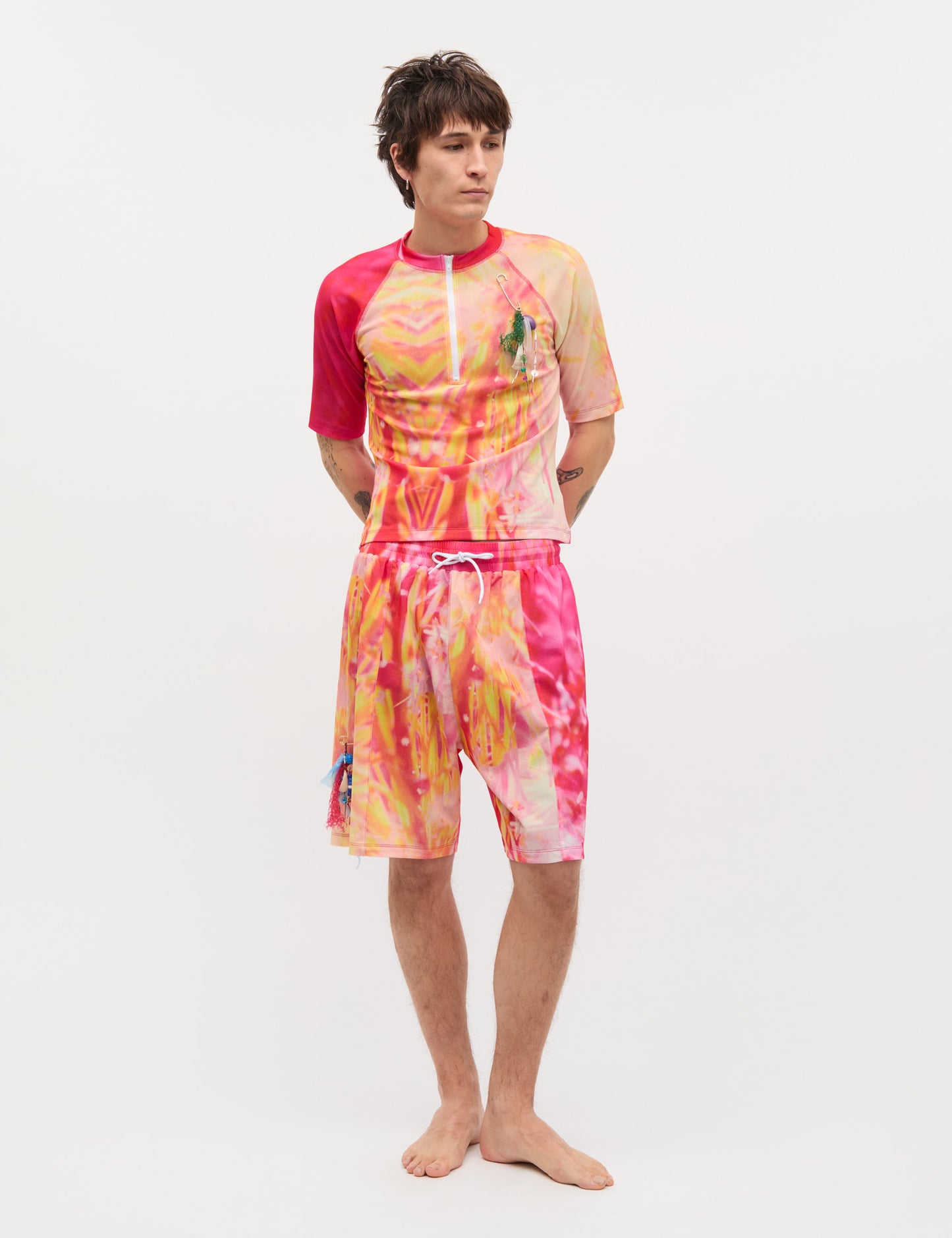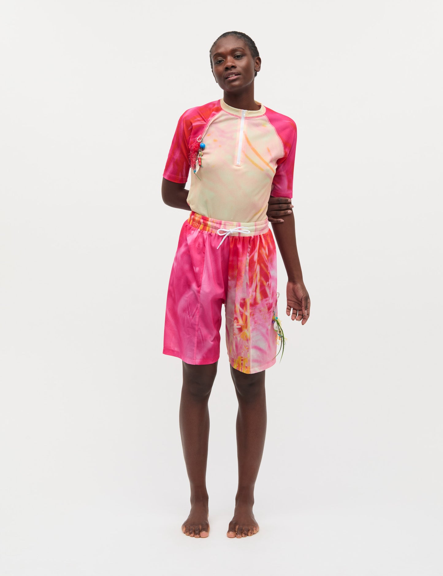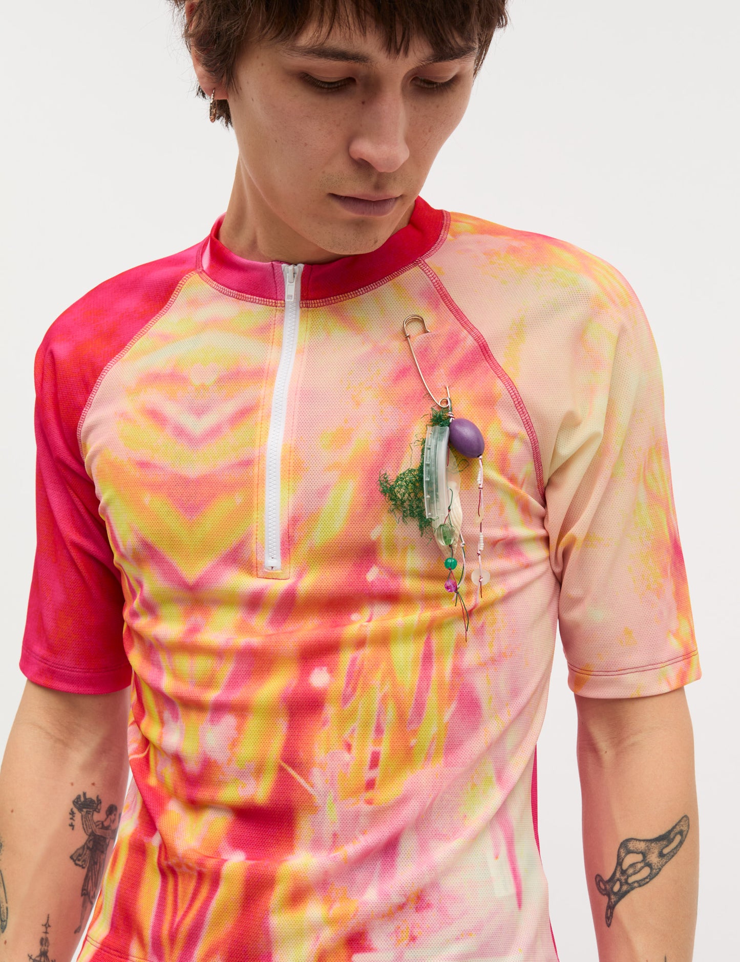 T-shirt with a round neckline and zipper from the swimwear collaboration with Pipilotti Rist x Louisiana x Mads Nørgaard – Copenhagen. The t-shirt is unique with vibrant prints from Rist's works and decorated with handmade pendants made of beads, capsules, fishing nets, and other beach finds. The t-shirt is unisex and has a straight up and down fit.