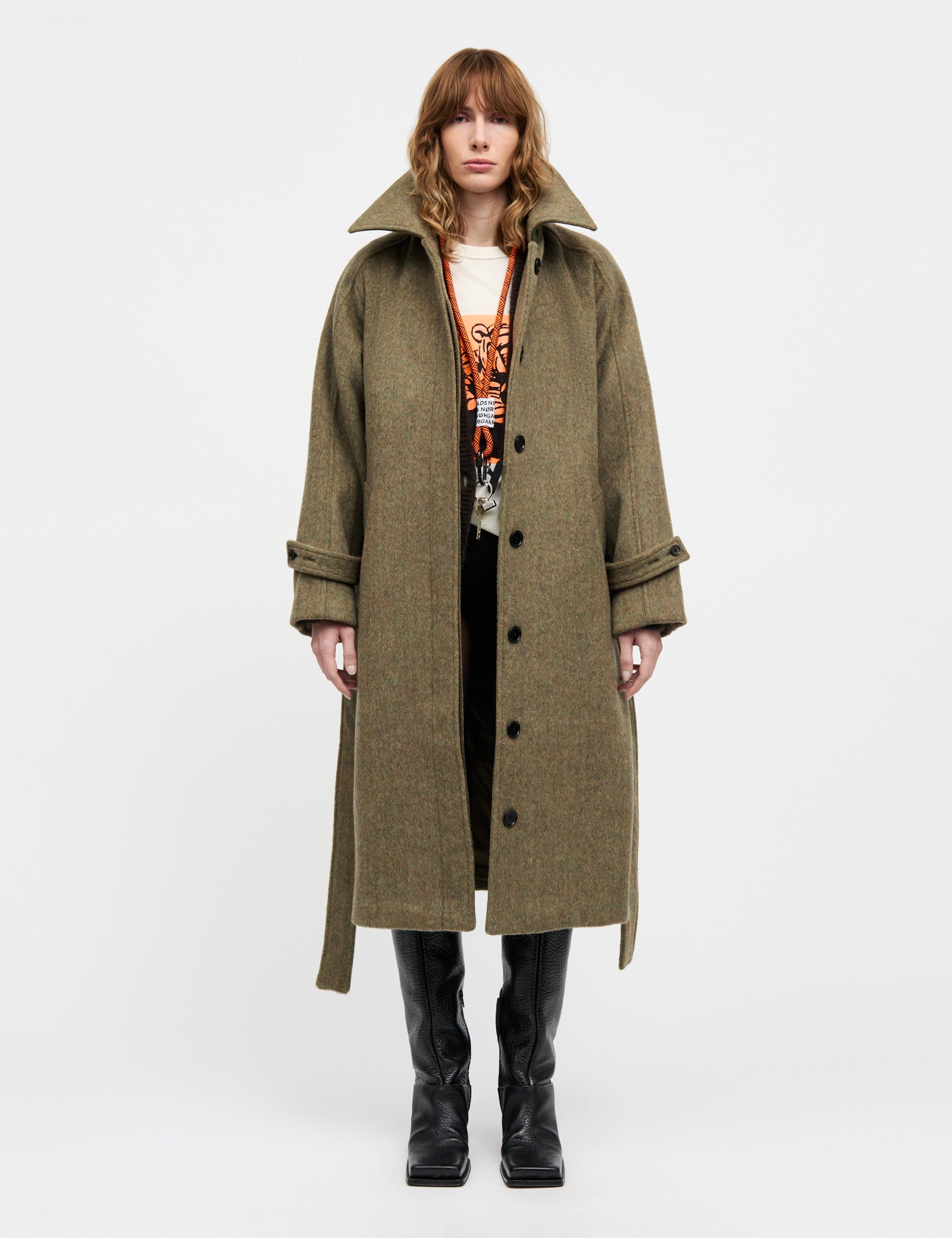Lockerer und langer Mantel mit großem Kragen, verstecktem Verschluss, Bindegürtel, definierten Eingriffstaschen und Trenchcoat-Ärmeln.