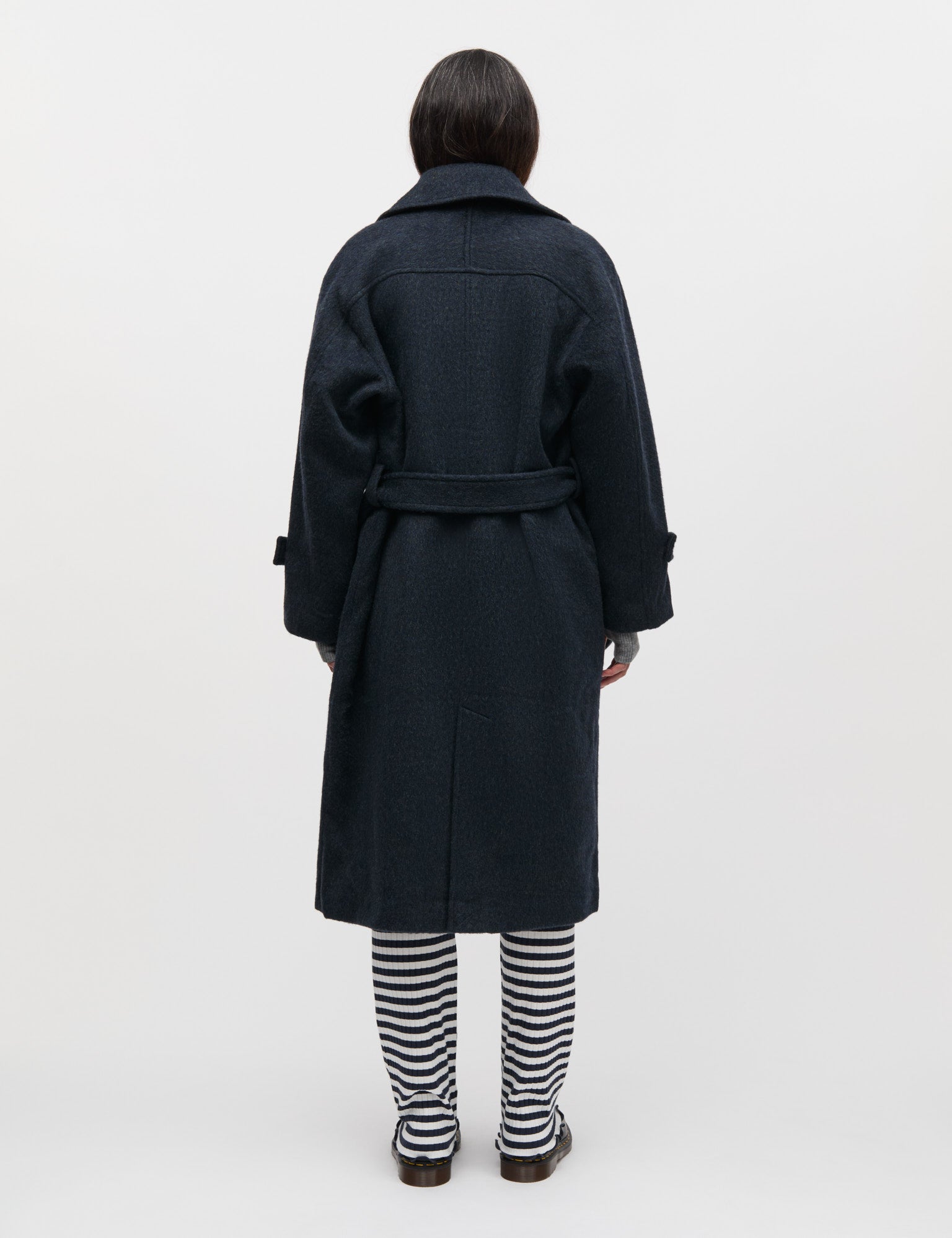 Lockerer und langer Mantel mit großem Kragen, verstecktem Verschluss, Bindegürtel, definierten Eingriffstaschen und Trenchcoat-Ärmeln.