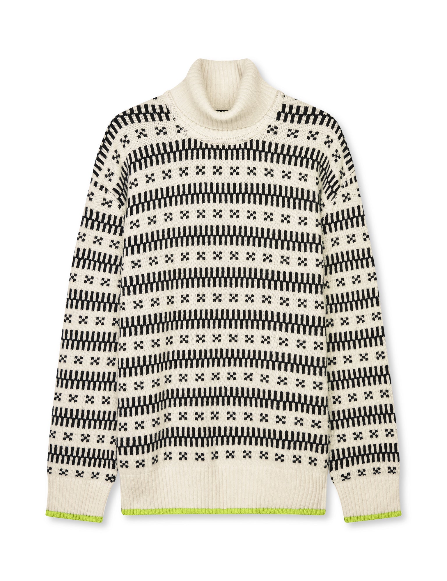 Kräftiger und boxy geschnittener Strickpullover mit Dropped-Shoulders, einem Rollkragen, einem nordischen Muster und neonfarbenen Rändern.