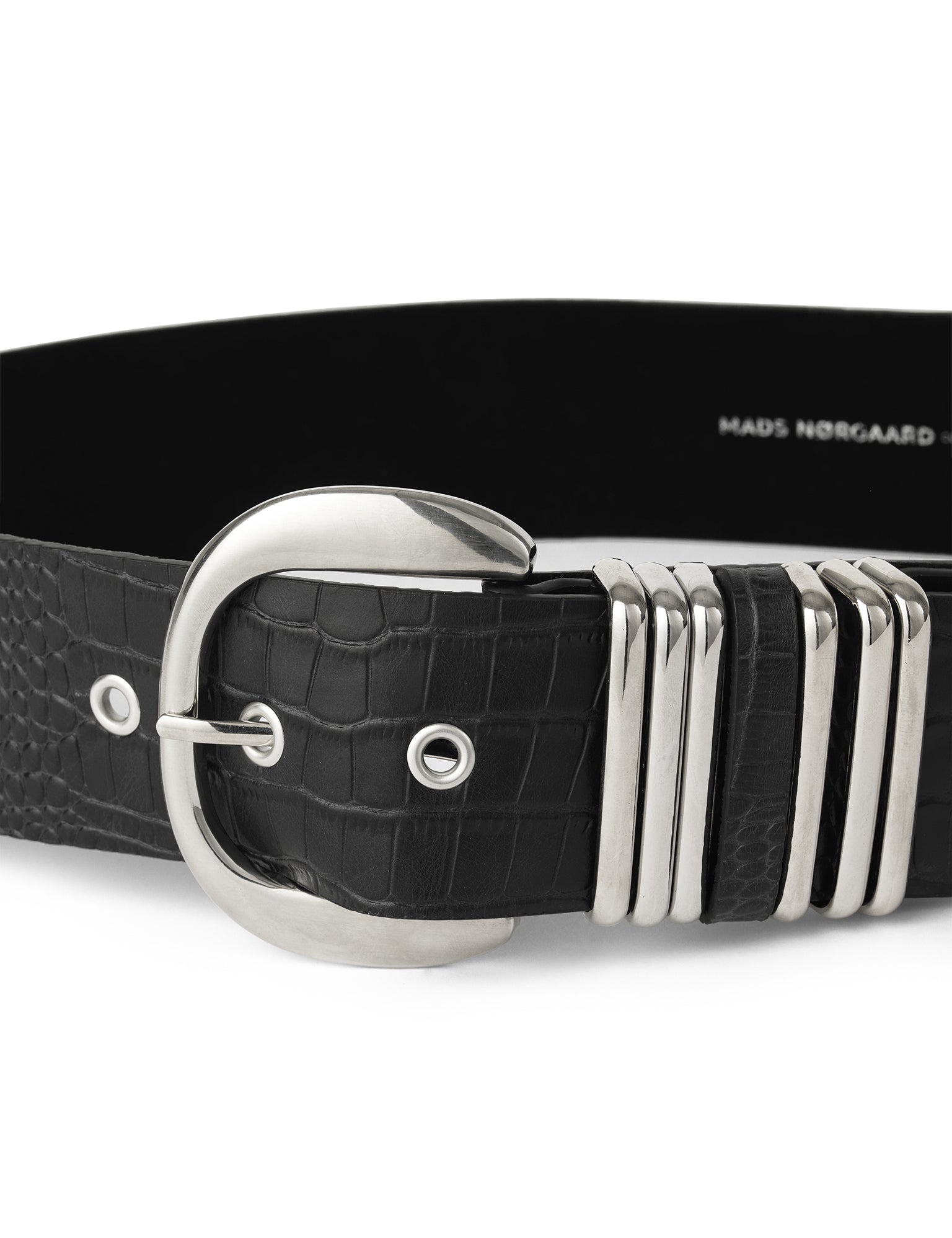 Ledergürtel mit Reptilprägung und Metallriemen sowie einer gebogenen Gürtelschnalle.