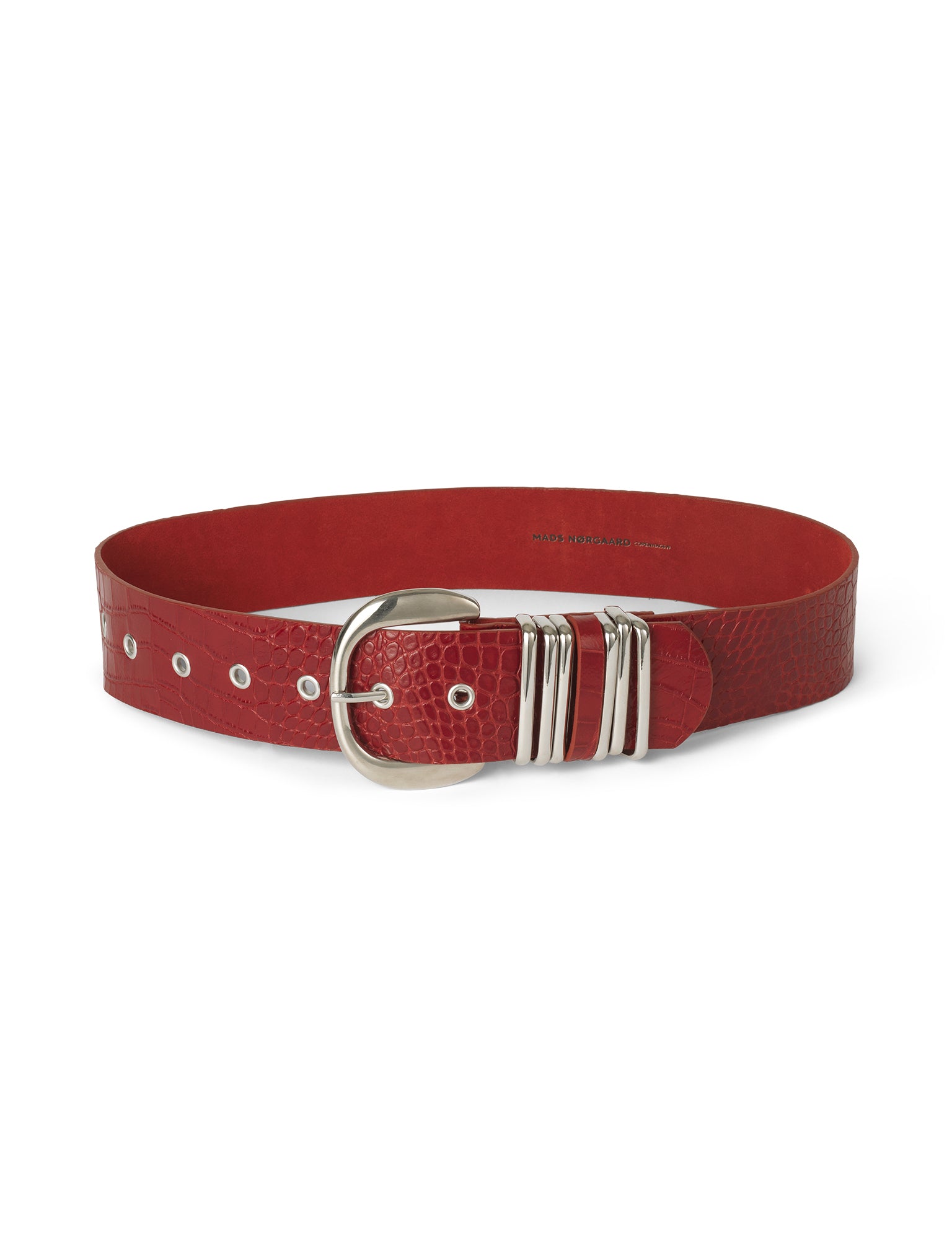 Ledergürtel mit Reptilprägung und Metallriemen sowie einer gebogenen Gürtelschnalle.