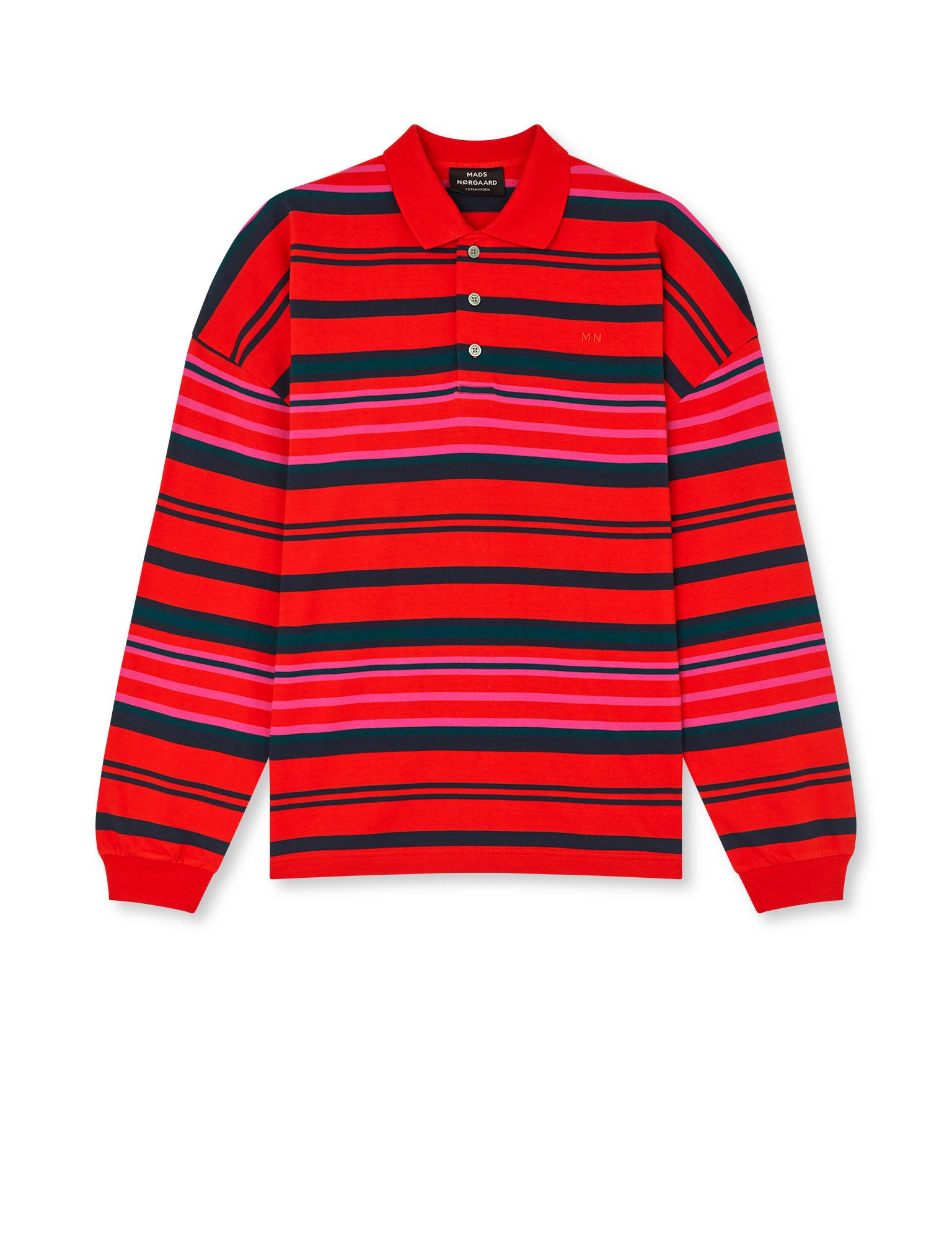 Langärmeliges Polohemd in geradem Schnitt mit Kragen und Knopfleiste. Das Design weist ein mehrfarbiges Streifenmuster in horizontalen Bahnen unterschiedlicher Breite auf. Die Ärmel sind mit Rippbündchen abgeschlossen, während der Körper einen glatten Saum für einen schlichten Look aufweist.