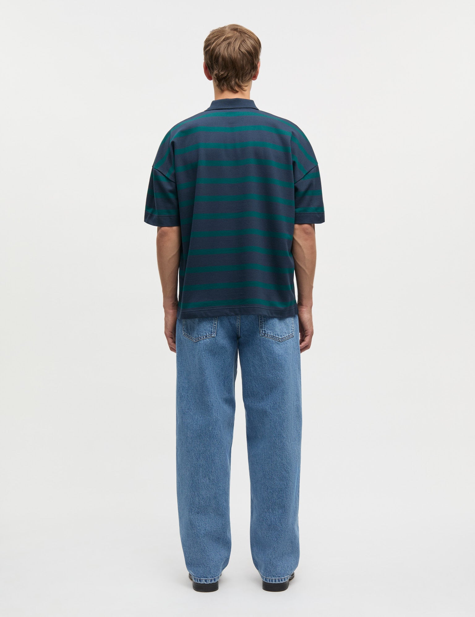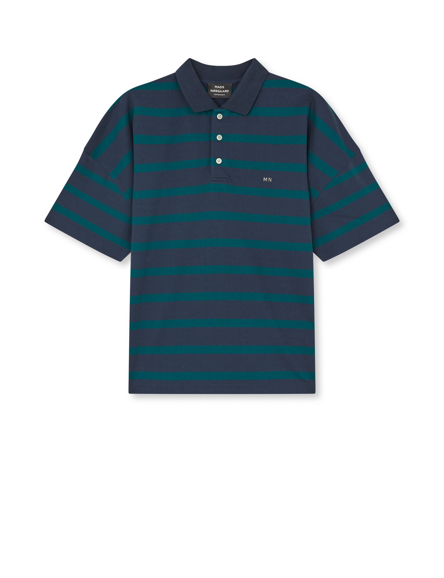 Kurzärmeliges Polohemd in geradem Schnitt mit klassischem Kragen und kurzer Knopfleiste. Das Design besticht durch breite, horizontale Streifen in zwei kontrastierenden Farben und ein kleines, schlichtes Ton-in-Ton-Sticklogo auf der Brust. Die Silhouette ist lässig und eher kastenförmig.