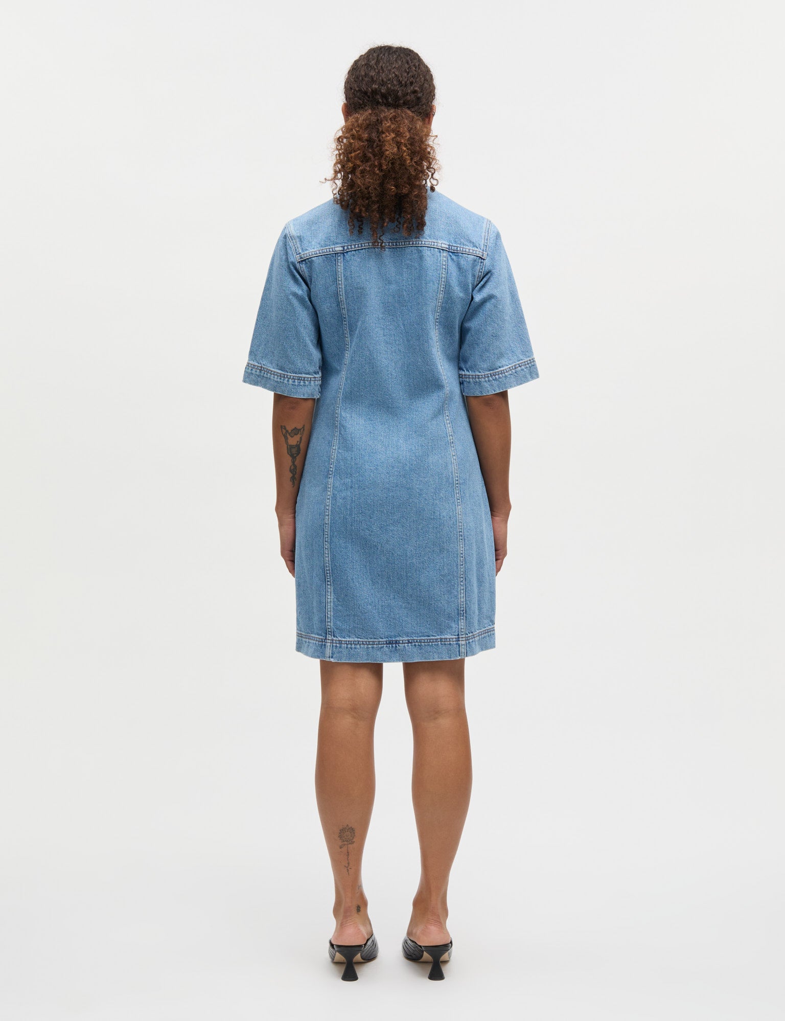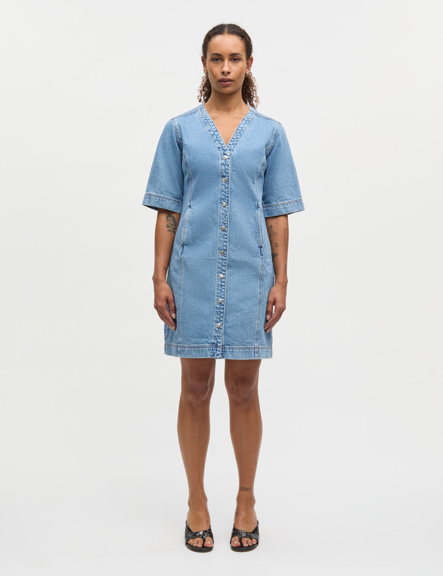 Kurzes Jeanskleid mit V-Ausschnitt und Seitentaschen. Das Kleid hat Knöpfe vorne, halblange Ärmel und eine gerade, figurbetonte Passform.