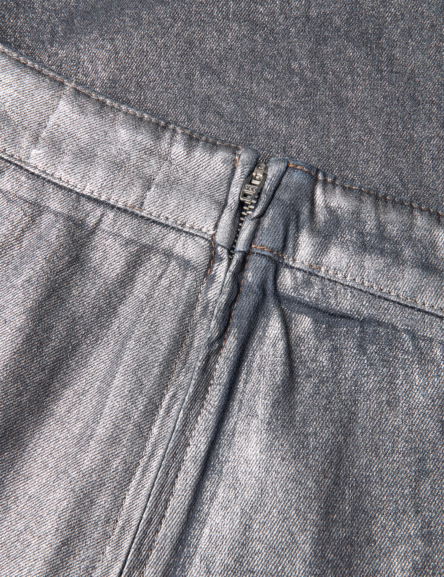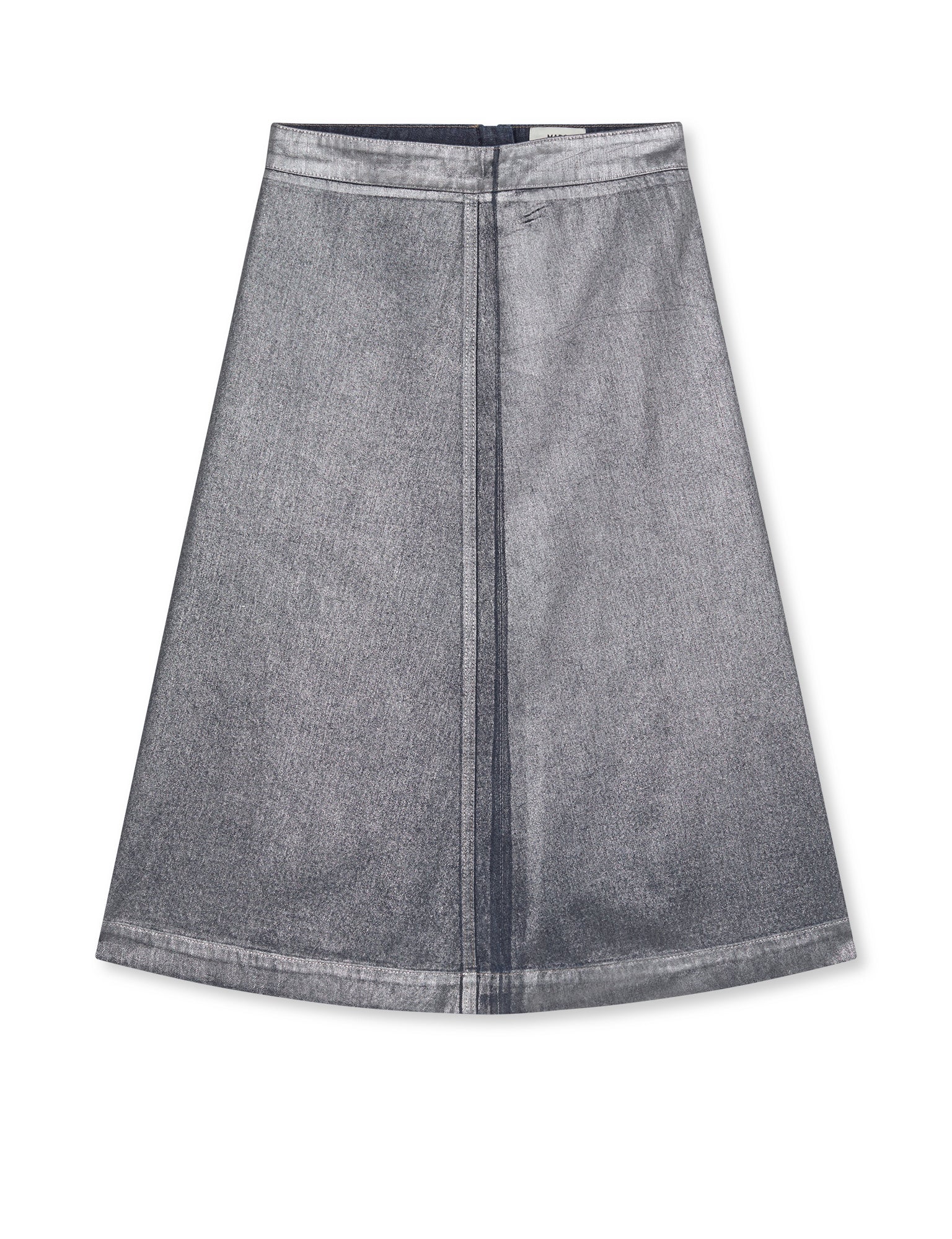 Wadenlanger und leichter A-Linien-Jeansrock mit hoher Taille, Taschen und einem festen Bund mit einem Reißverschluss hinten.
