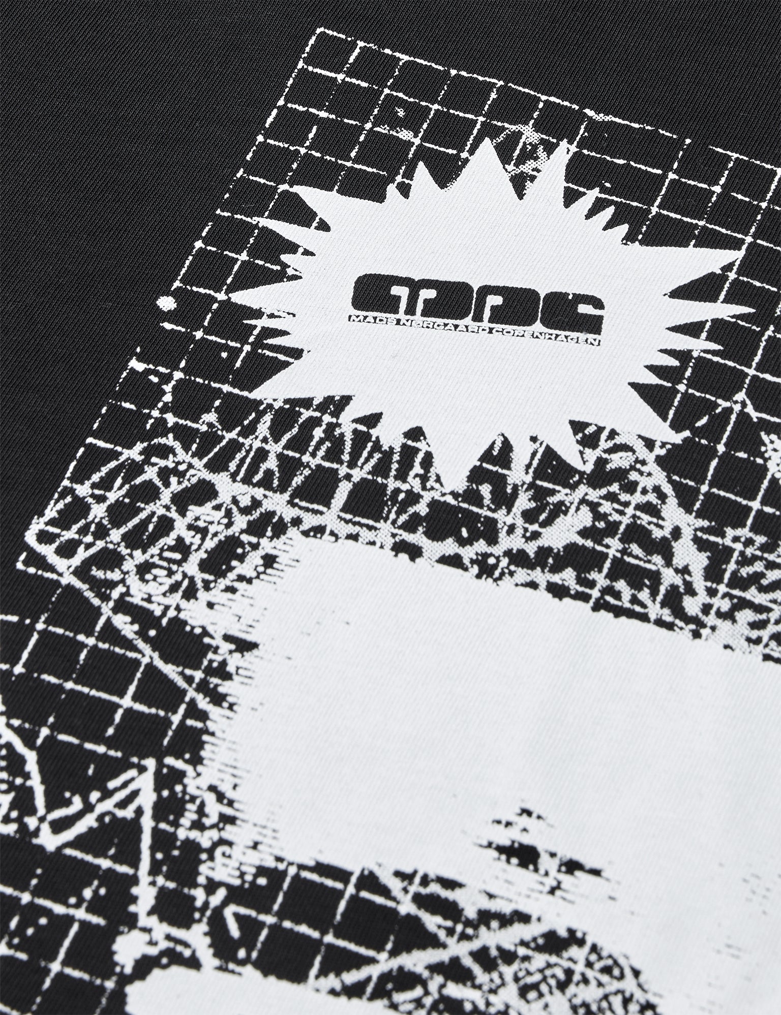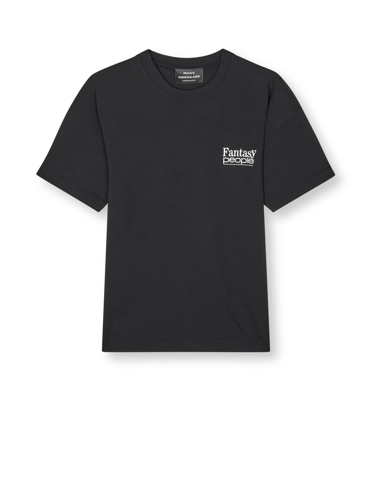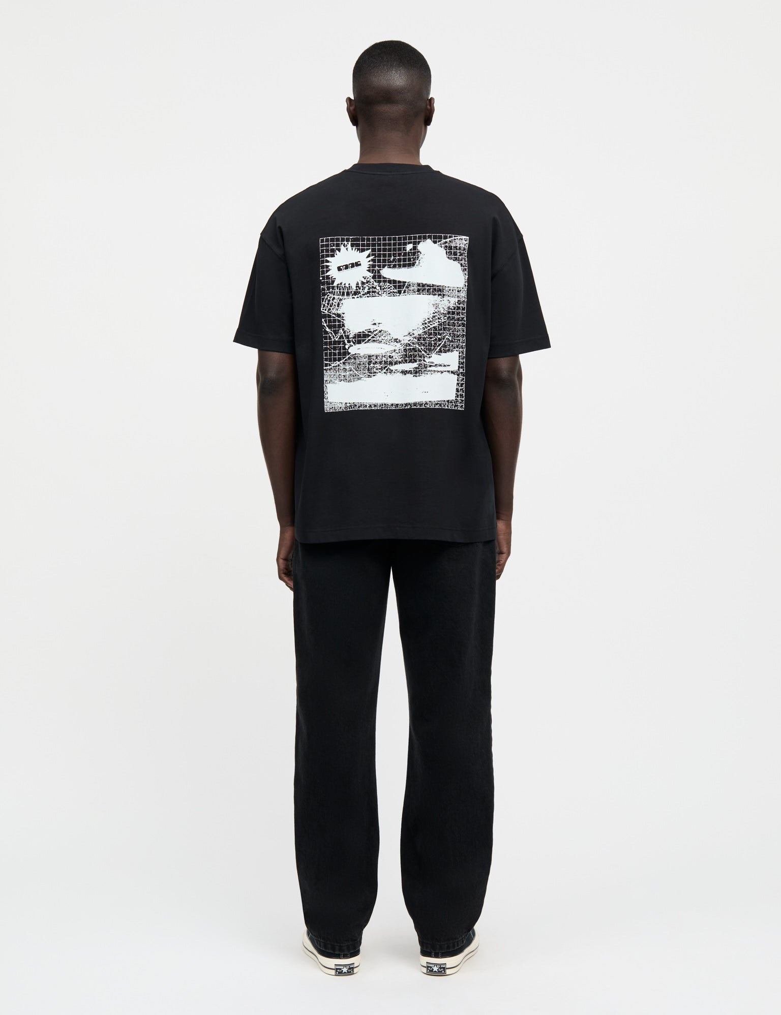 Ein etwas schwereres T-Shirt mit Dropped-Shoulders, kurzen Ärmeln, einem Rundhalsausschnitt und einem Print auf Brust und Rücken.
