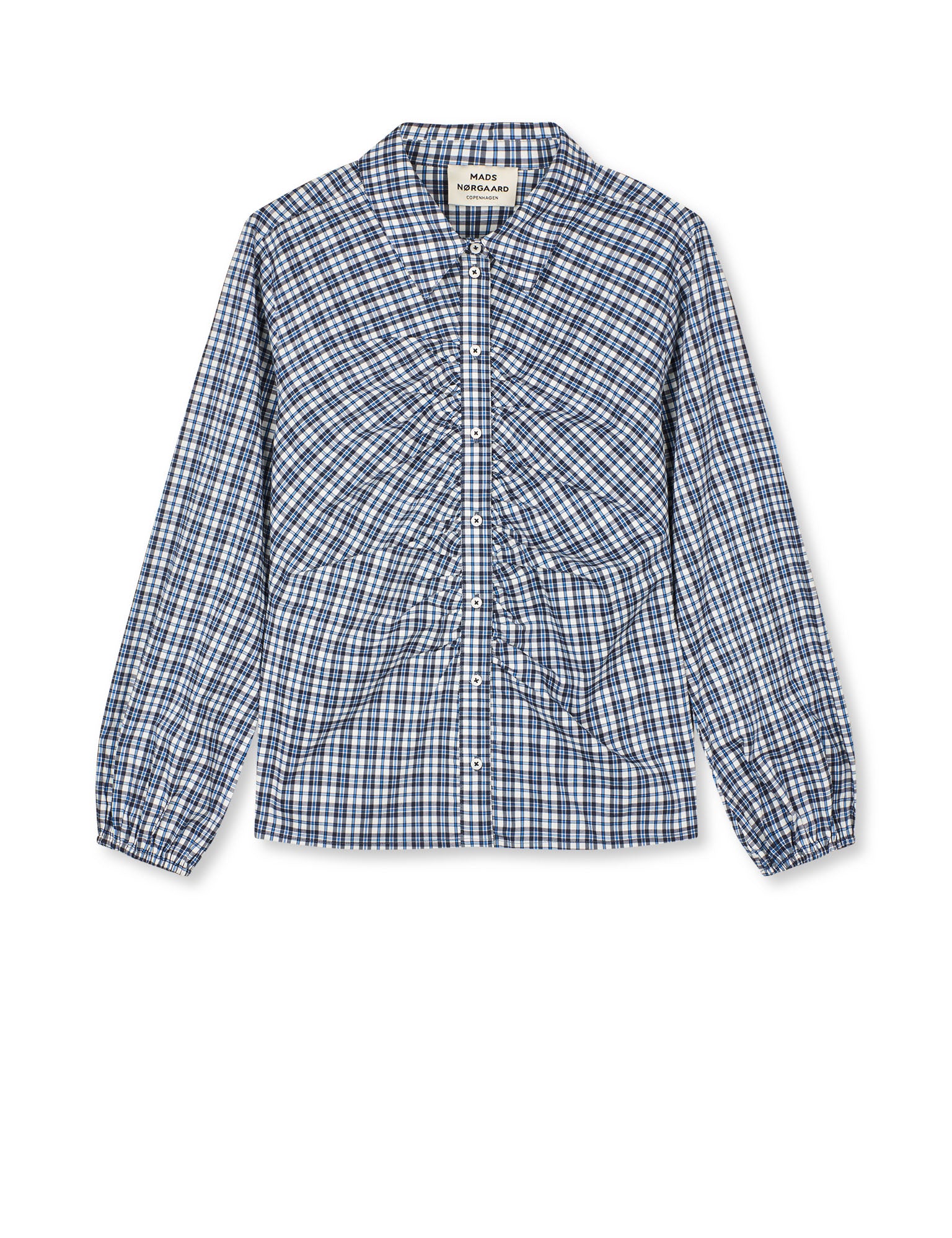 Tailliertes Hemd mit geraffter Vorderseite, kleinen Knöpfen, Gummizügen anstelle von Manschetten und mit einem abgerundeten Turn-down-Kragen.