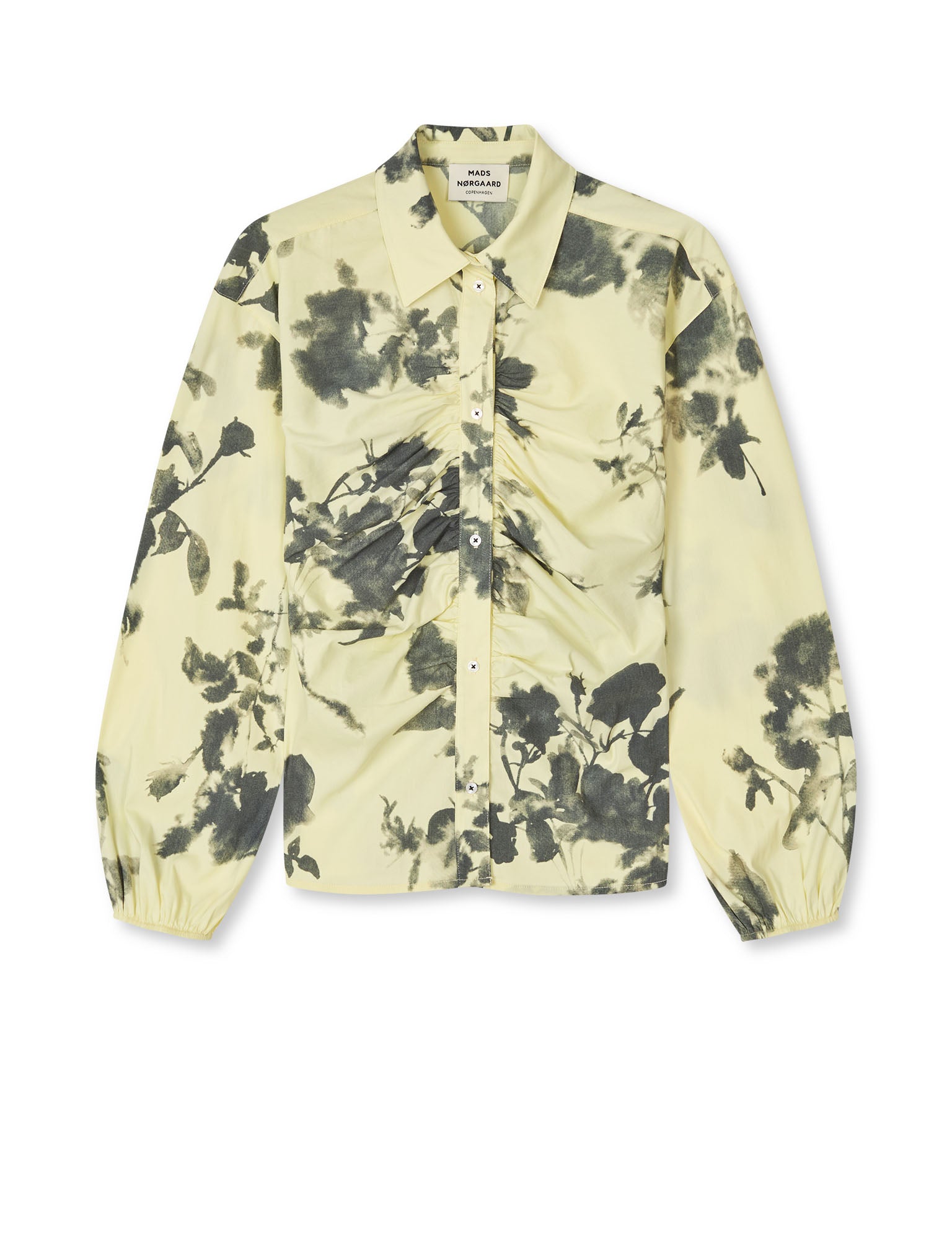 Das Poplinea Clara Shirt AOP ist leicht, weich, körperbetont, drapiert und mit nostalgischen Blumen versehen.