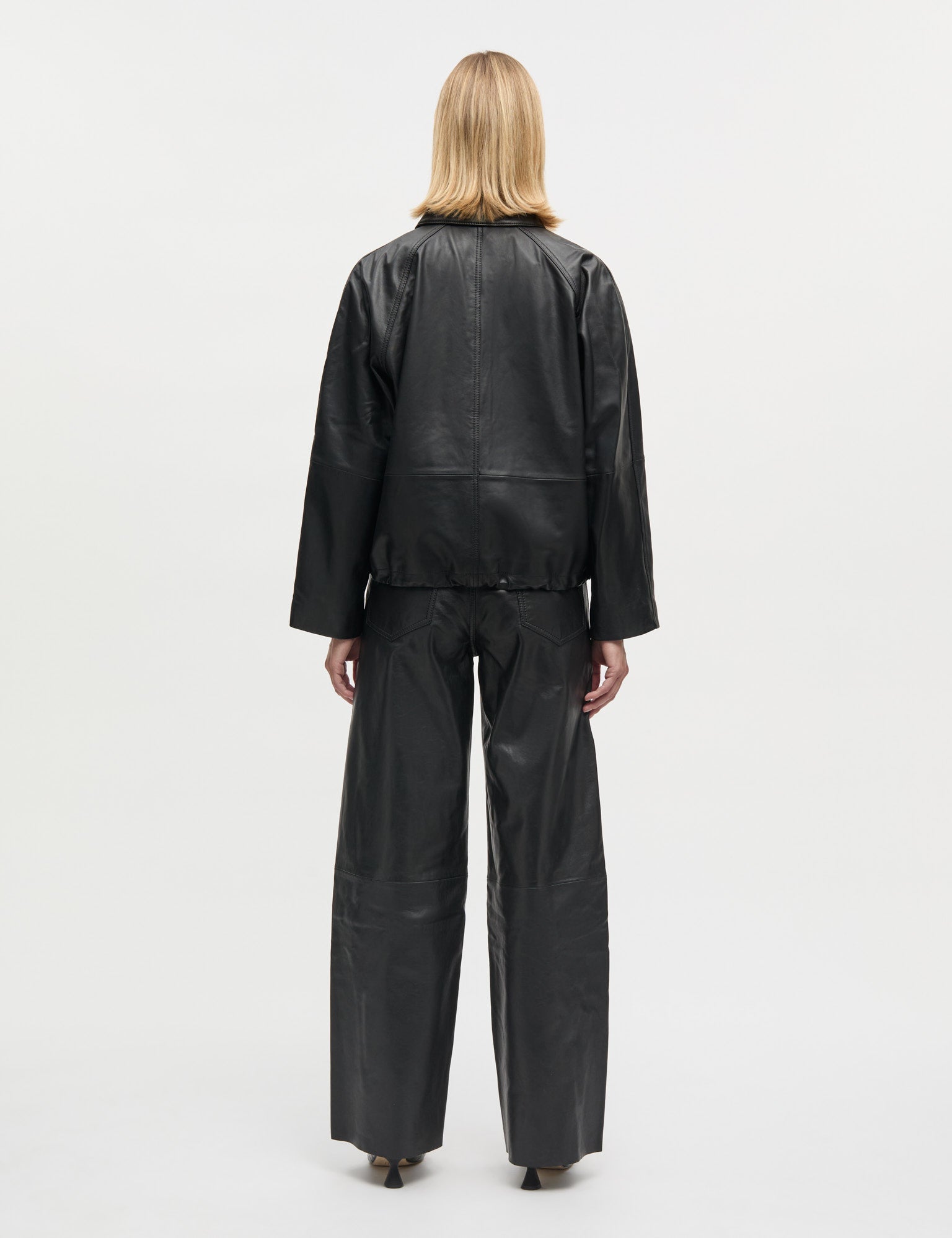 Weite Lederhose mit mittelhoher Taille, markanten Einsätzen und schrägen Nähten, die der Hose einen schönen und stilvollen Fall verleihen. Klassische Fünf-Taschen-Konstruktion, markante Bundlinie und dezente Nähte entlang der Beine.