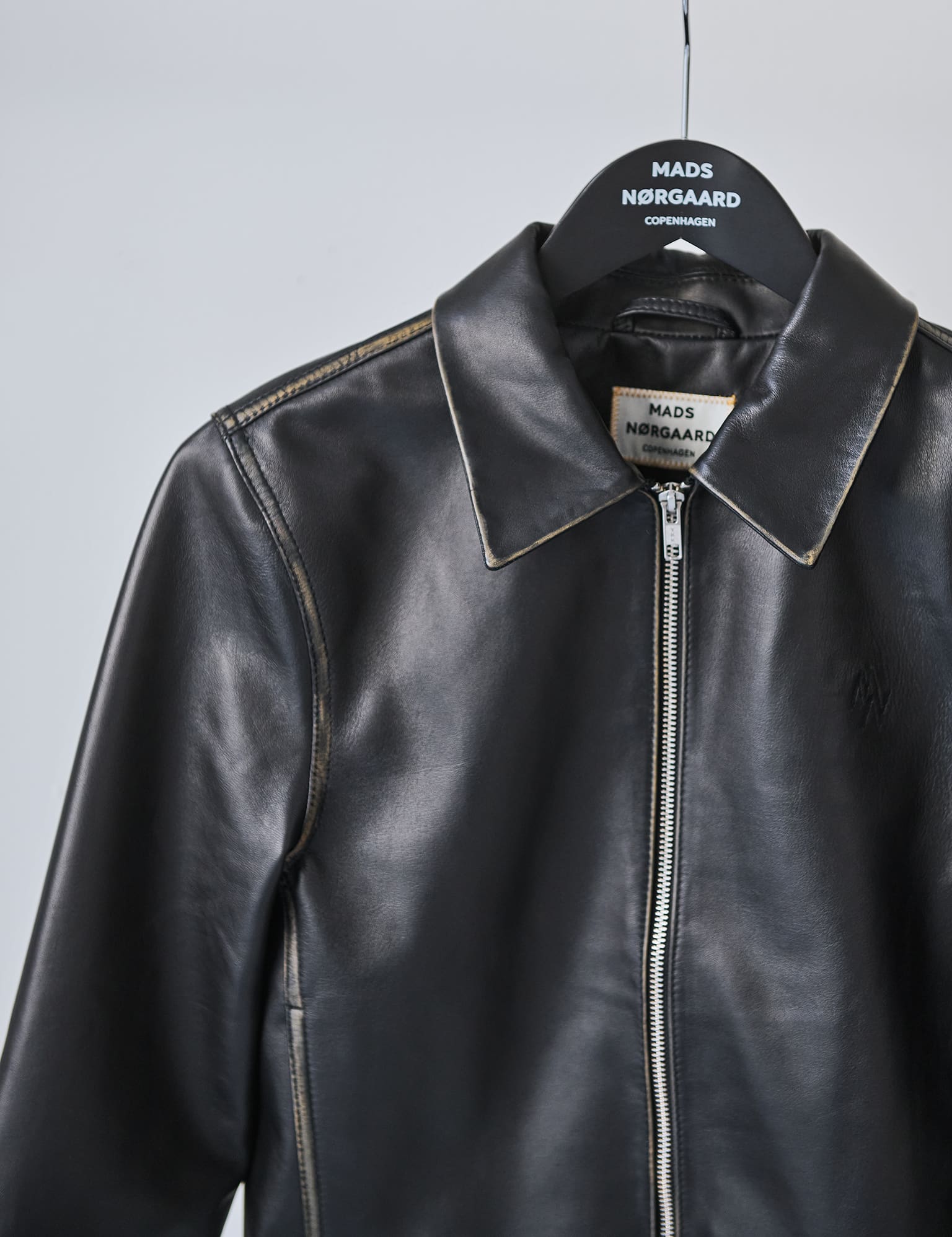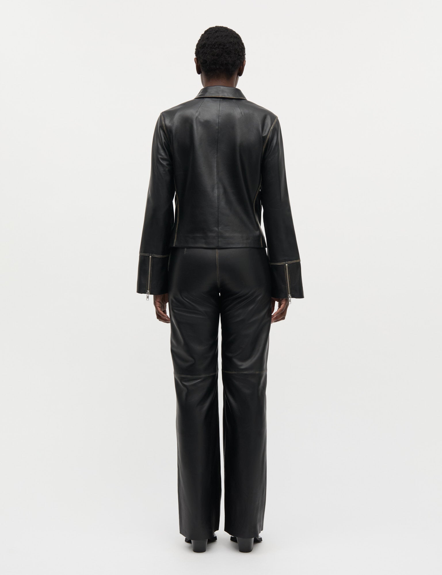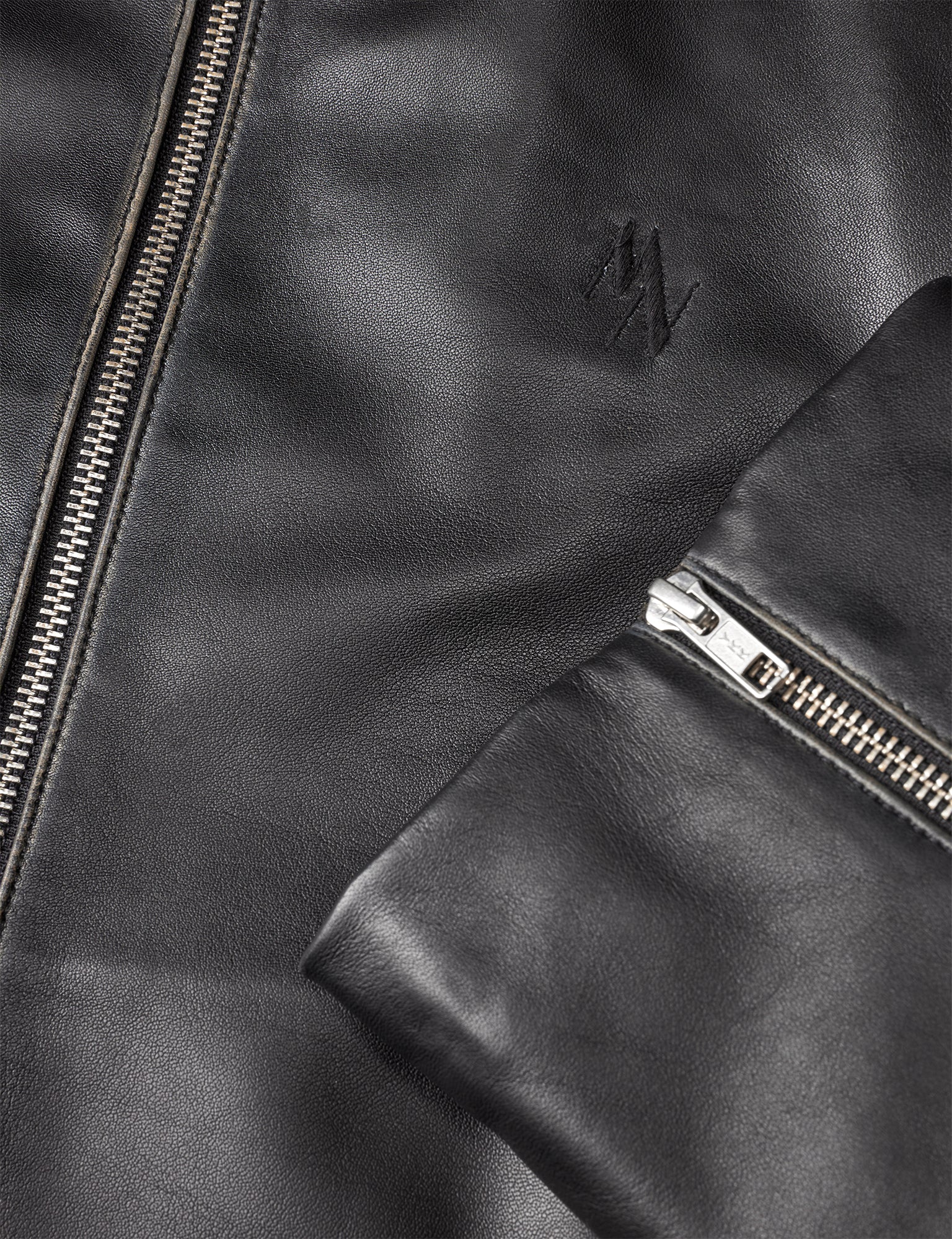 Eng anliegende Lederjacke mit Reißverschluss, sichtbaren Nähten, breiten Manschetten mit Reißverschlüssen und mit einem aufgestickten Mini-Logo.