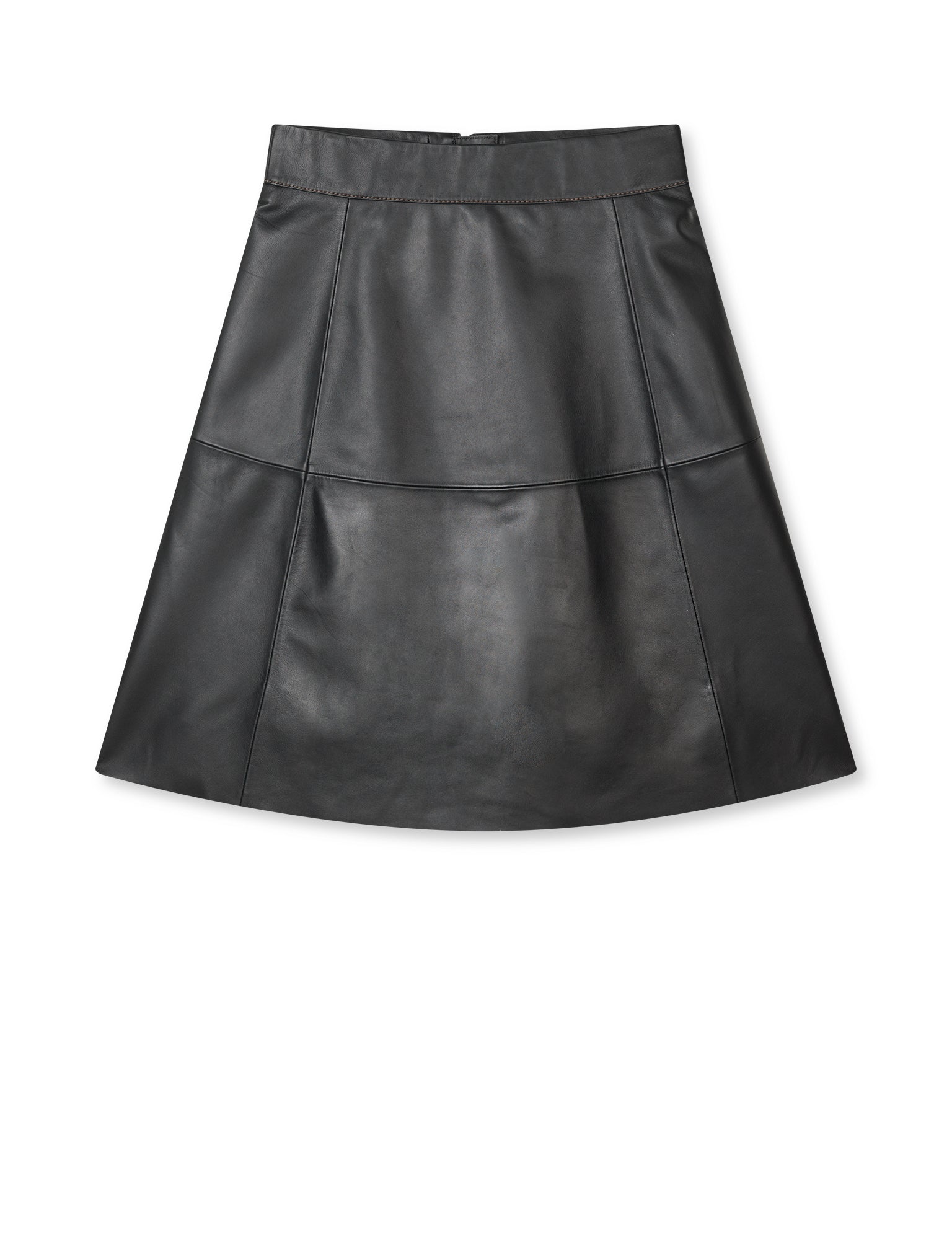 A-shaped and knee-length leather skirt with visible stitching, a high waist and fixed waistband with a zip at the back. Knielanger A-Linien-Lederrock mit sichtbaren Nähten, hoher Taille und festem Bund mit Reißverschluss hinten.