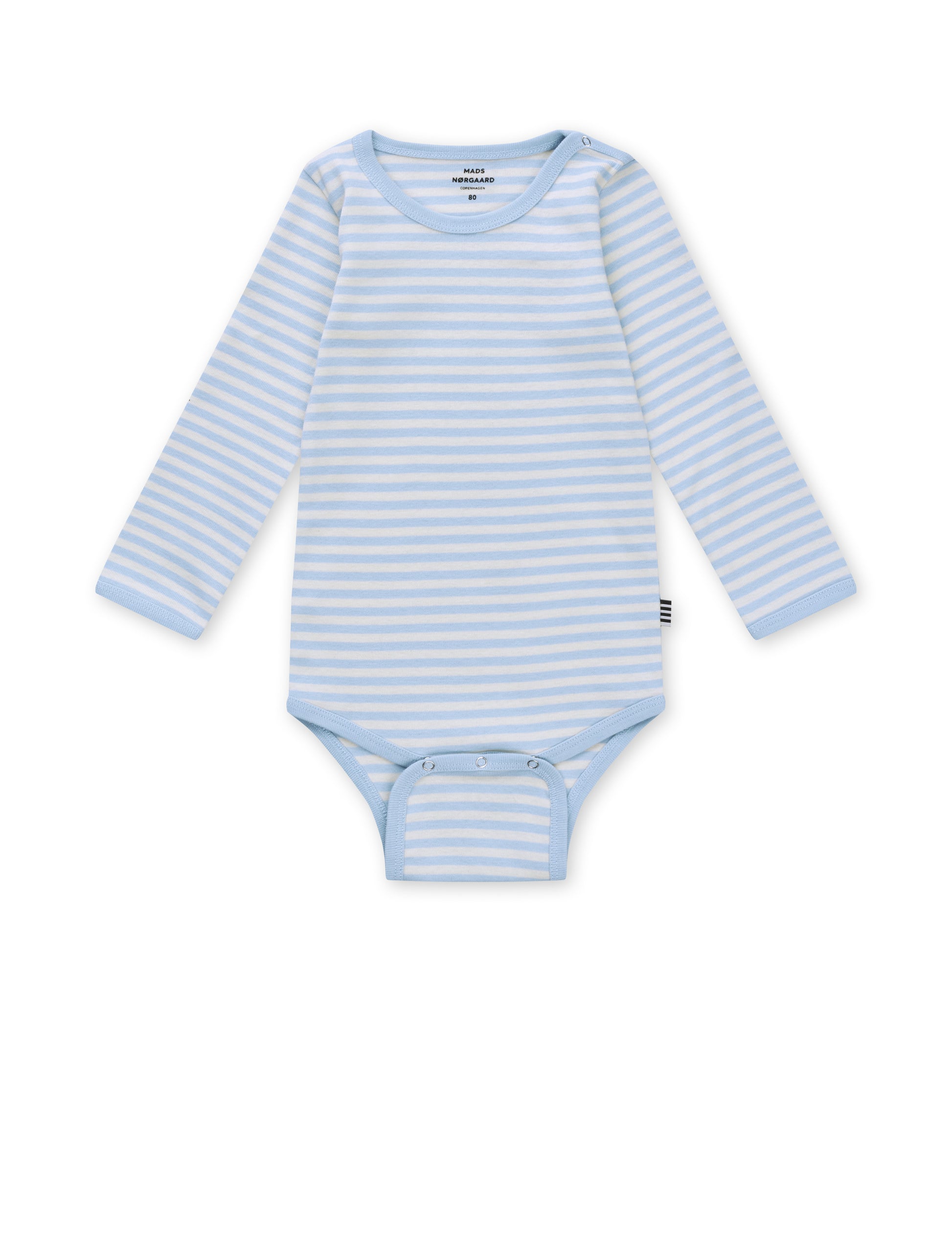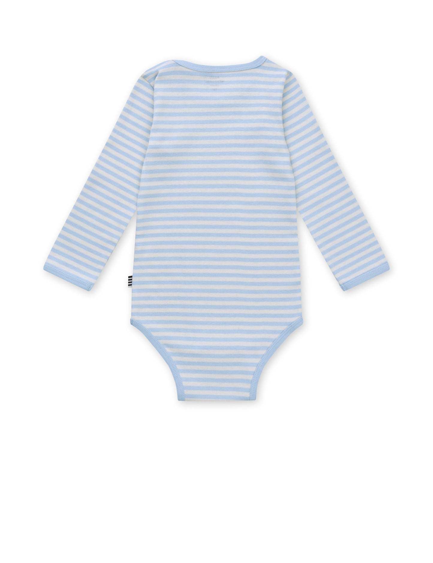 Der gestreifte Bodystocking ist aus weicher Baumwolle gefertigt. Unten befinden sich drei kleine Druckknöpfe und einer am Hals.