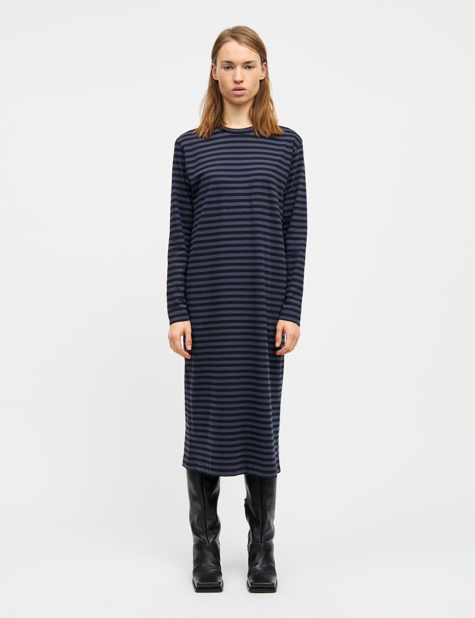 Lockeres, weiches, leichtes und wadenlanges T-Shirt-Kleid mit Querstreifen.