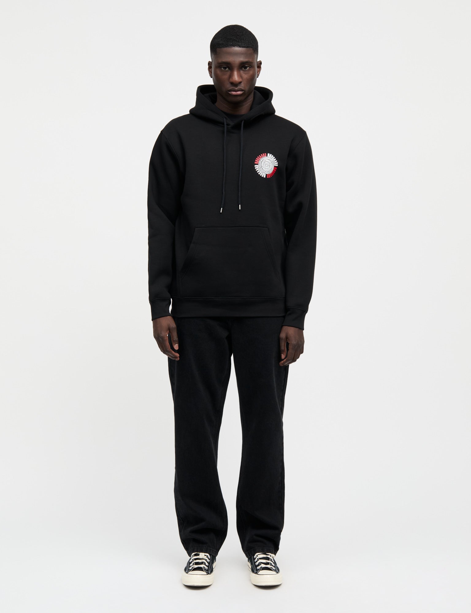 Weicher Kapuzenpullover mit einer Kängurutasche, Rippbündchen und einem Print auf Brust und Rücken.