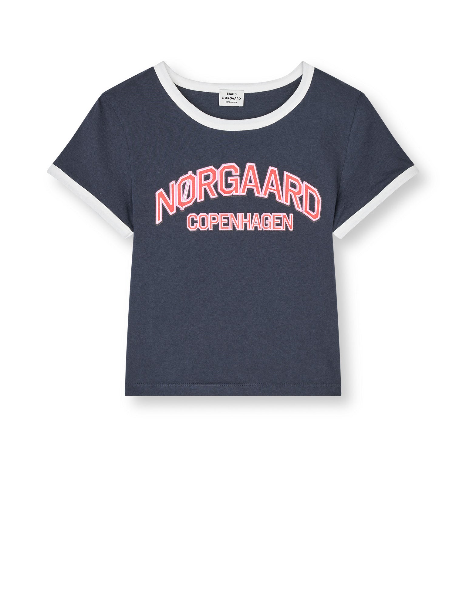 Weiches, boxy und leicht tailliert geschnittenes T-Shirt mit einem Print auf der Brust und mit kontrastierenden Rändern.