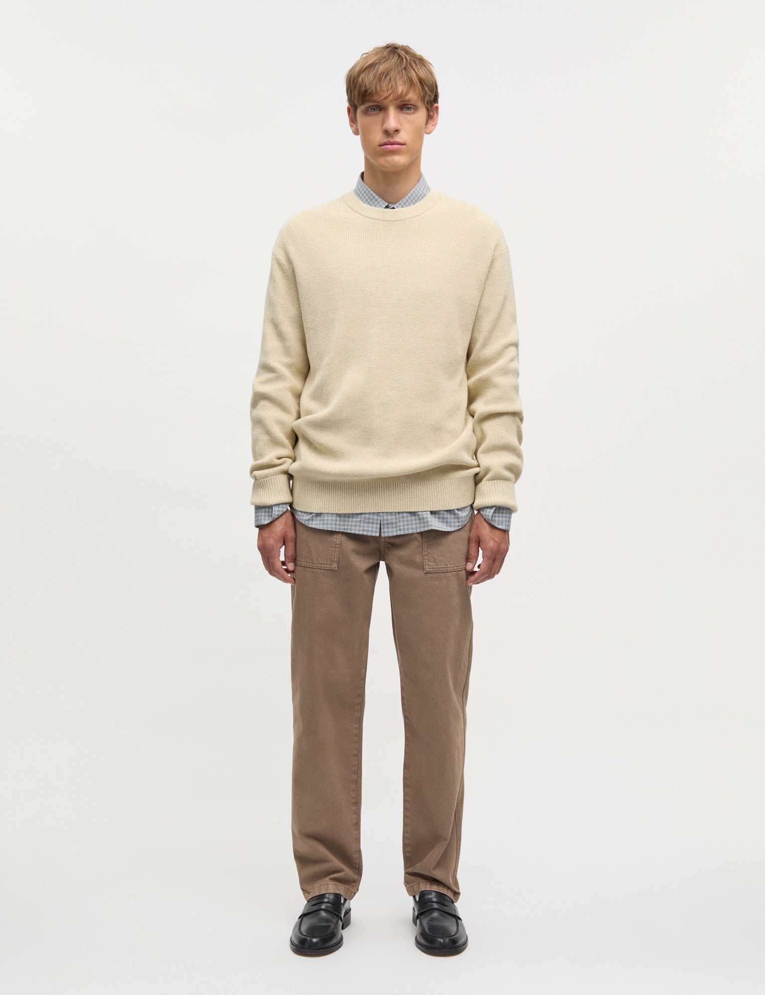 Strickpullover mit Rundhalsausschnitt und langen Ärmeln. Gerade Passform und Rippdetails an Halsausschnitt, Handgelenken und Saum.