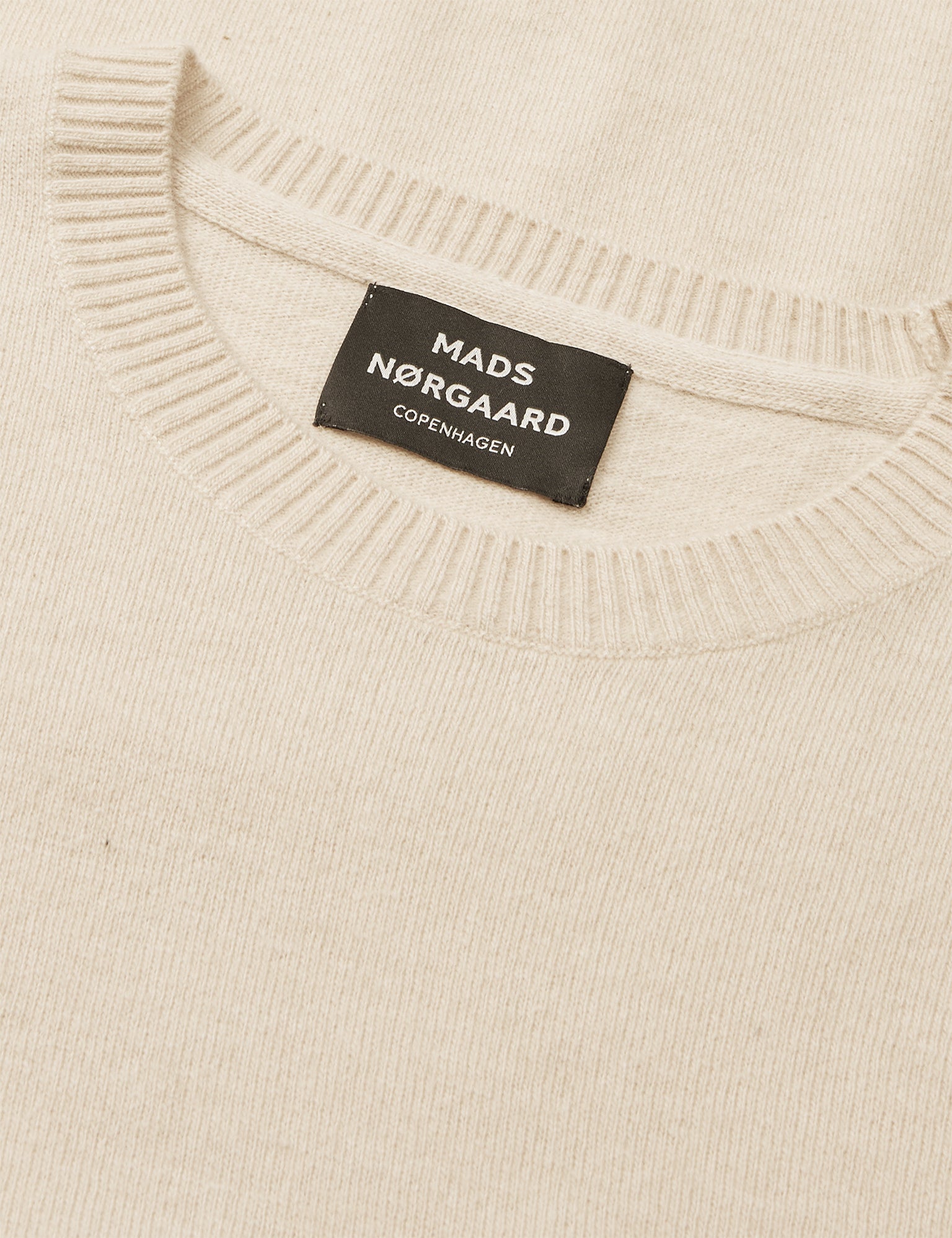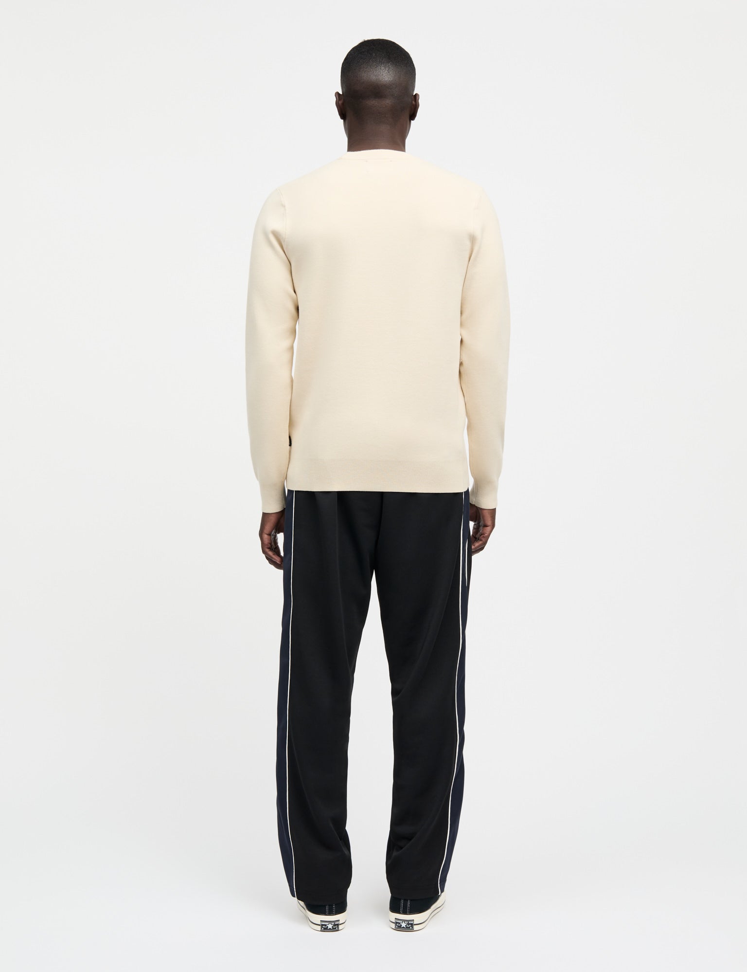 Weicher Strickpullover mit gestrickten Rippbündchen und einem kleinen aufgestickten Initialen-Logo auf Hüfthöhe.