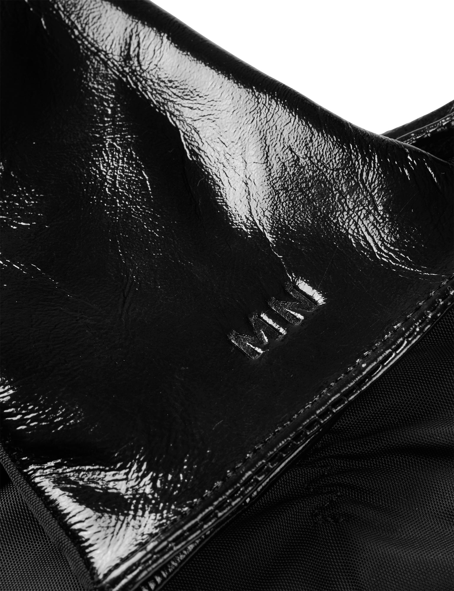 Handschuhe mit glänzendem Leder auf dem Handrücken und weichem, flexiblem Stoff in der Handfläche.