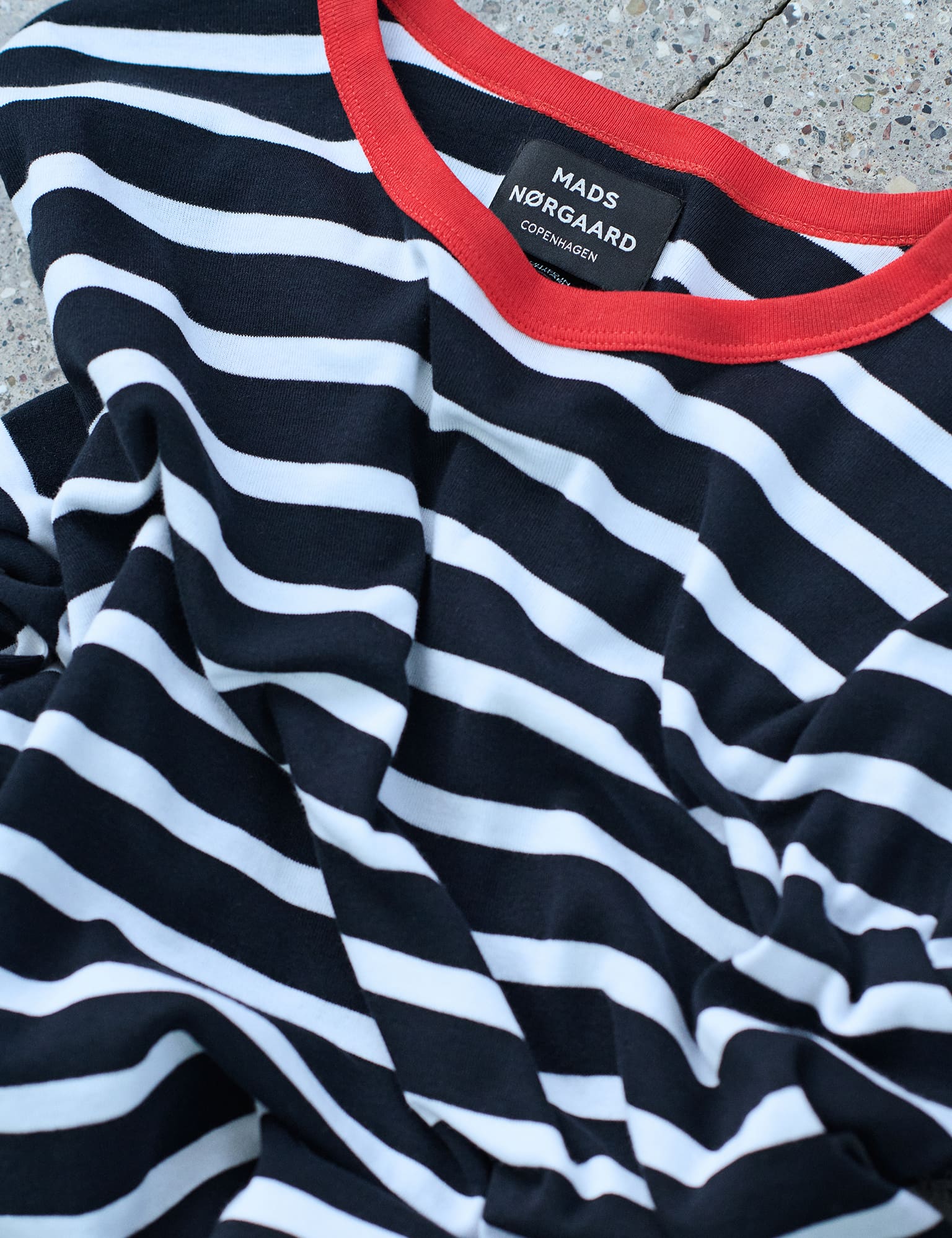 Langärmeliges T-Shirt mit horizontalen Streifen. Reguläre Passform und Rundhalsausschnitt mit einfarbigem Rand. Dieses T-Shirt ist so entworfen, dass es perfekt sitzt und sich genau richtig anfühlt. Es wird aus langfaseriger Baumwolle gefertigt und bietet dadurch ein weiches, angenehmes Tragegefühl sowie eine Passform, die auch nach vielen Wäschen erhalten bleibt. Der Stoff wird bei einem familiengeführten Strickbetrieb in Dänemark, gestrickt, der seit Jahrzehnten ein fester Partner von Mads Nørgaard ist. Hier wird die lokale Stricktradition mit Stolz gepflegt, und jeder einzelne Schritt der Produktion wird sorgfältig begleitet. Das T-Shirt hat einen klassischen Schnitt mit einem modernen Twist – sei es im Detail, in der Farbe oder im Streifenmuster.