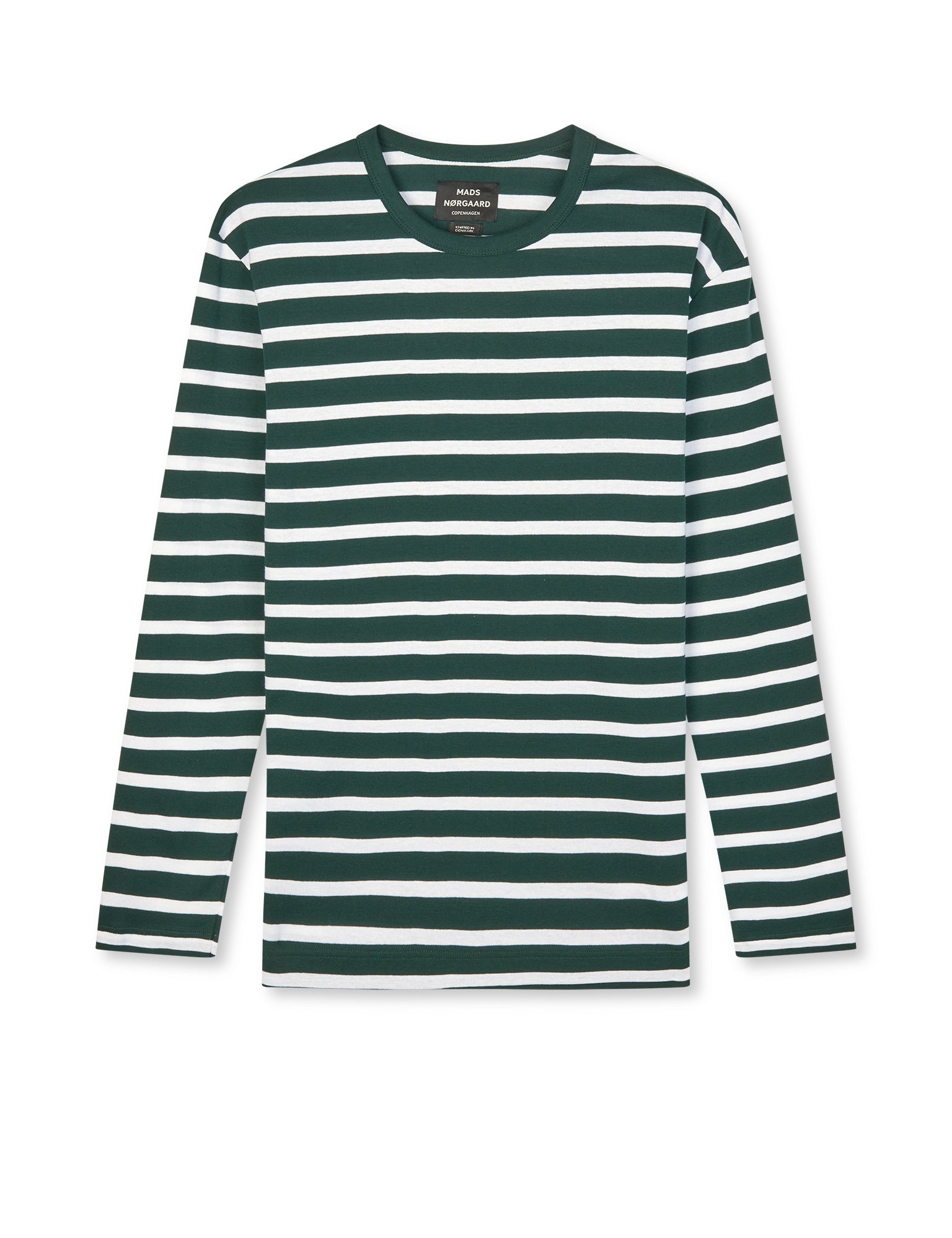 Das Bio-Langarmshirt Trio Rib Tobias besitzt abwechselnd schmale und breite Streifen, eine schmale Passform und einen Rundhalsausschnitt mit angenähtem Saum.